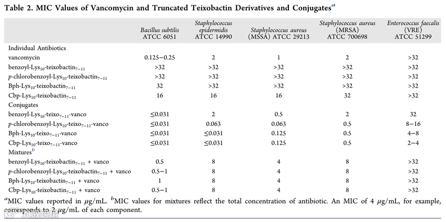 -vanco)的MIC为2-4 μg/mL。这些发现表明,万古霉素结合泰斯巴汀最小药效团策略相当有效,可以提高万古霉素对一些重要的革兰氏阳性病菌的抗菌活性。