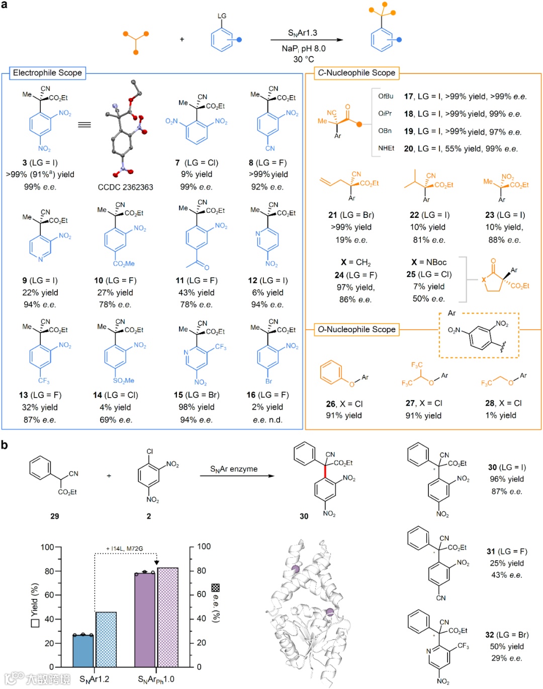 在最优条件下,作者对亲电试剂的底物范围进行了考察(图3a),结果显示含有不同官能团(如:氰基、三氟甲基、酯基、酮羰基、砜取代基以及吡啶环)的硝基芳烃(3-16)均能兼容该反应,以中等至优异的产率和对映选择性获得单一的SNAr产物。类似地,多种碳基亲核试剂(如:含有较大酯基(17、18、19)、酰胺基(20)、2-烷基取代基(21、22)、环状β-酮酯(24、25))和氧基亲核试剂(如:苯酚(26)、活性醇(27和28))均能顺利地转化为相应的C-C键和C-O键偶联产物,特别是SNAr1.3可催化2-硝基丙酸乙酯的C-芳基化,从而成功构建含氮四元立体中心(23),并且所得的α-硝基酯产物可进一步转化为有价值的手性砌块(如:α-氨基酸和α-叔胺)。其次,SNAr生物催化剂还可用于构建1,1-二芳基季碳骨架。对一系列SNAr变体进行筛选后,作者发现工程化变体SNAr1.2可有效催化芳基氯化物2和苯基氰基乙酸乙酯29的SNAr反应并以27%的产率和46% e.e.值获得产物30(图3b)。进一步对SNAr1.2进行突变后获得双突变体SNAr Ph1.0,其活性是母体酶的3倍并且能以84% e.e.值获得产物30。值得一提的是,当使用芳基碘化物5作为底物时能以96%的产率和87% e.e.值获得产物30,并且该酶也可以生成1,1-二(杂)芳基化产物31和32,不过立体选择性有所降低。