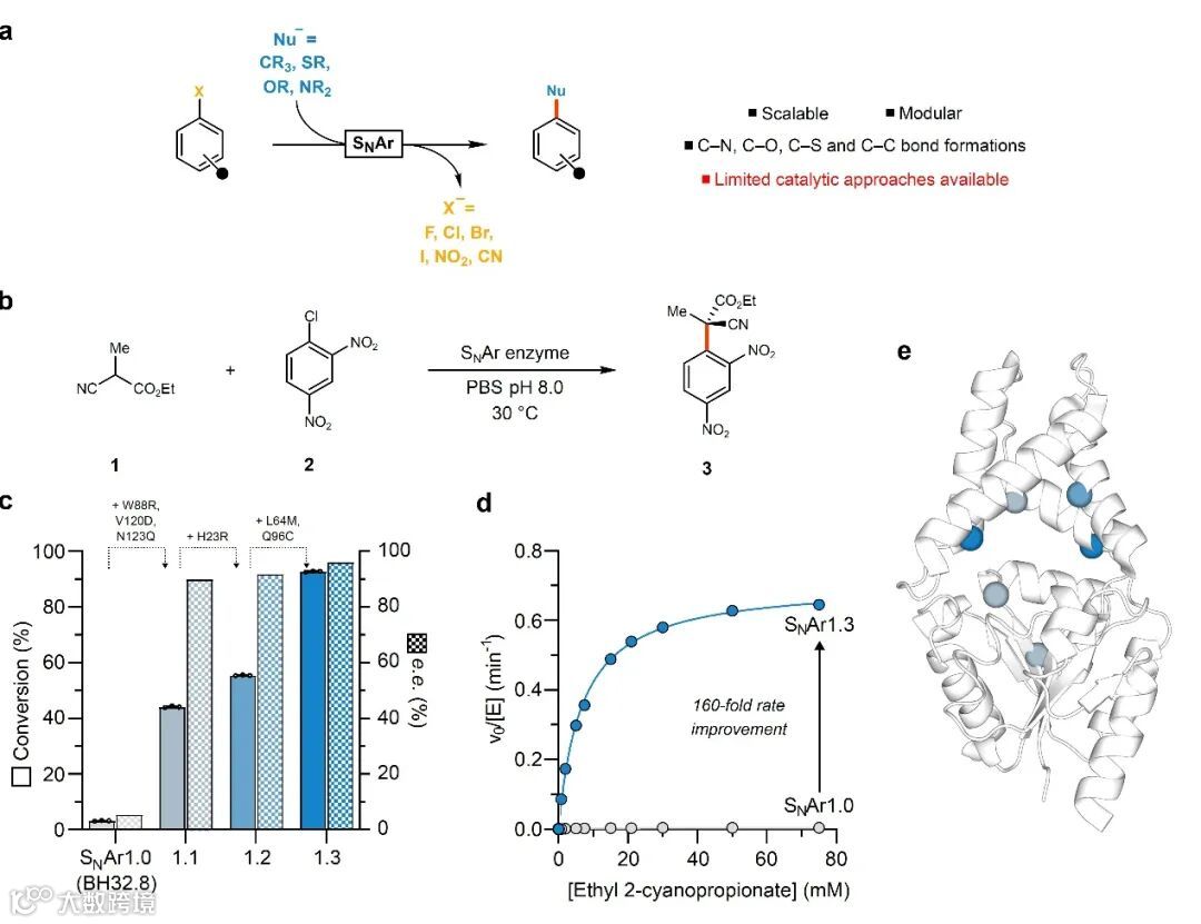 芳香亲核取代(SNAr)反应是一类非常重要的有机反应,广泛应用于药物分子、农用化学品和聚合物合成之中。如图1a所示,SNAr反应能够对(杂)芳环进行官能团化,即缺电子(杂)芳基卤化物亲电试剂与碳、氧、氮或硫亲核试剂进行偶联便可模块化构建相应的C-C和C-X(X=O、N、S)键。然而,由于缺乏有效和通用的SNAr反应催化剂,该领域仍存在一定的局限性。此外,现有的SNAr化学方法与立体选择性和/或区域选择性过程不相容,这在构建复杂分子时会带来巨大的麻烦。为了解决这些问题,化学家利用小型有机氢键或相转移催化剂开发了少量的对映选择性SNAr反应,但是这些有机催化剂的效率十分有限,并且对新型底物兼容性不高。自然界中,酶凭借其高效的活性和精准的立体控制引起了化学家的广泛关注,不过目前还尚未报道过天然酶介导的选择性和汇聚性SNAr反应。虽然4-氯苯甲酰-CoA A脱卤酶、5-硝基邻氨基苯甲酸氨基水解酶和阿特拉津氯水解酶被认为通过SNAr途径起作用,但其机制涉及金属-氢氧化物中间体或共价芳基酯的水解,进而表明上述酶仅适用于水作为亲核试剂。