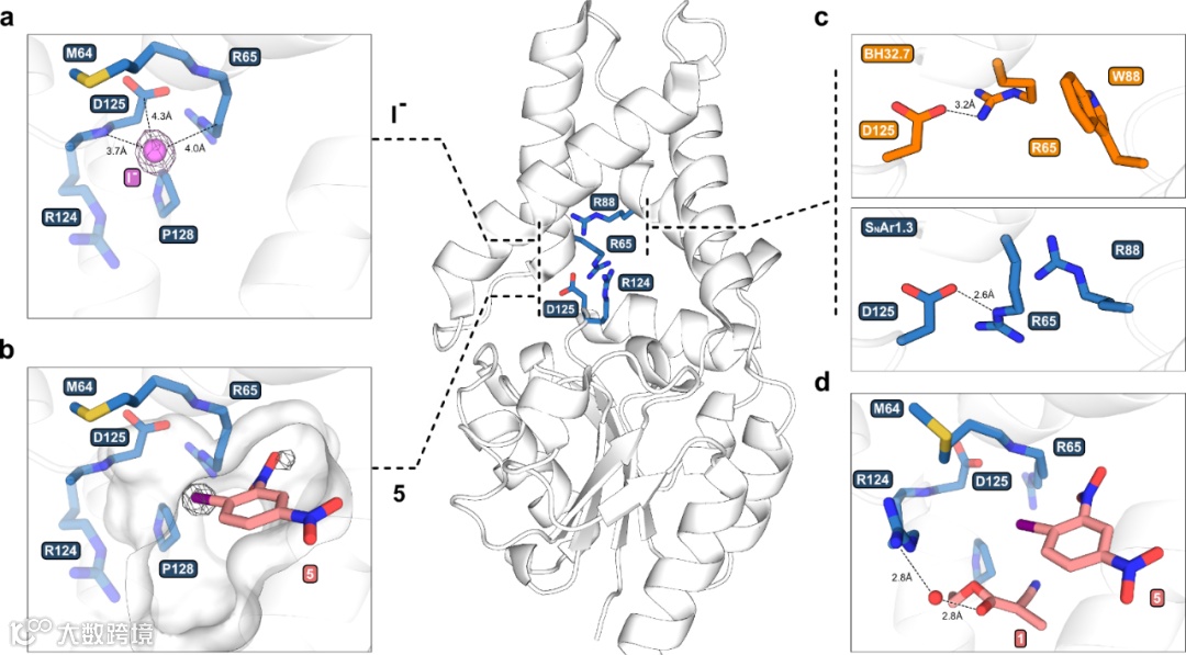 为了进一步探究反应机理,作者进行了一系列实验,具体而言:1)在无亲核偶联试剂的条件下,将SNAr1.3及其它变体与芳基卤化物5一起培养并检测卤化物释放和蛋白质质量随时间的变化,结果显示在测定条件下没有观察到芳基卤化物水解产生的酚类产物,并且不会积累任何共价中间体,进而说明酶-底物共价中间体不太可能参与SNAr1.3催化过程;2)在冷冻前用100 mM KI浸泡SNAr1.3晶体,所得结构揭示了两个内部碘化物结合位点,其中Met64、Arg65、 Arg124、Asp125和Pro128占用了最多的位点(~85%,图4a),特别是Arg和Asp残基是天然蛋白质中卤化物结合位点的共同特征;3)将底物5浸泡SNAr1.3晶体后,所得结构显示出两个明显的异常信号,此信号与碘化物取代基密切相关,进而表明底物结合具有相当大的构象异质性,特别是卤化物5的取代基直接放置在上述卤化物结合腔附近(图4b),使得其芳基底物下方有一个可容纳亲核偶联试剂的空腔;4)在结构分析的指导下,对卤化物结合位点的残基进行定点诱变后,作者发现R124A和D125N/A突变分别导致速率大幅下降180倍和68/22倍,M64A和R65A的速率下降幅度较小,这说明卤化物结合位点对高效催化的重要性;5)对SNAr1.0和SNAr1.3结构进行比较可以看出卤化物结合口袋是如何通过定向进化进行调控,特别是W88R突变导致Arg65重新定位以优化其与Asp125的静电相互作用(图4c)。虽然M64A、R65A和D125A卤化腔突变保留了高水平的选择性(图4d),但R124A突变导致对映体选择性显著降低,进而表明Arg124也可能在定位和/或活化亲核试剂1进行选择性催化中发挥作用,分子动力学模拟支持了这一结果,即模拟显示1的烯醇化物与Arg124形成氢键相互作用的构象。