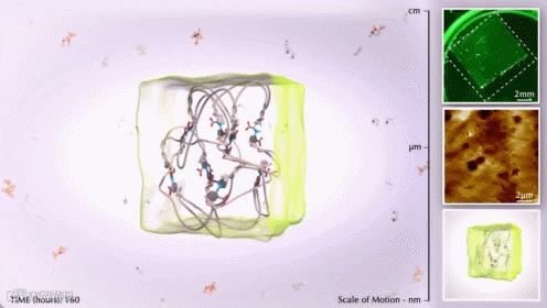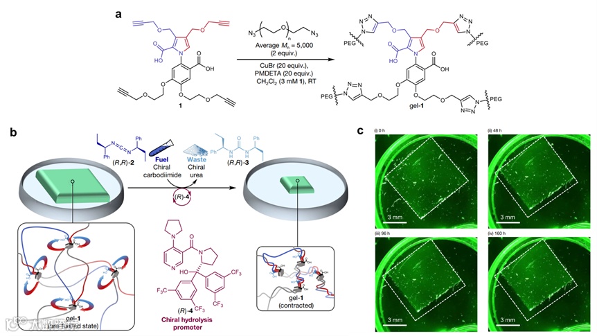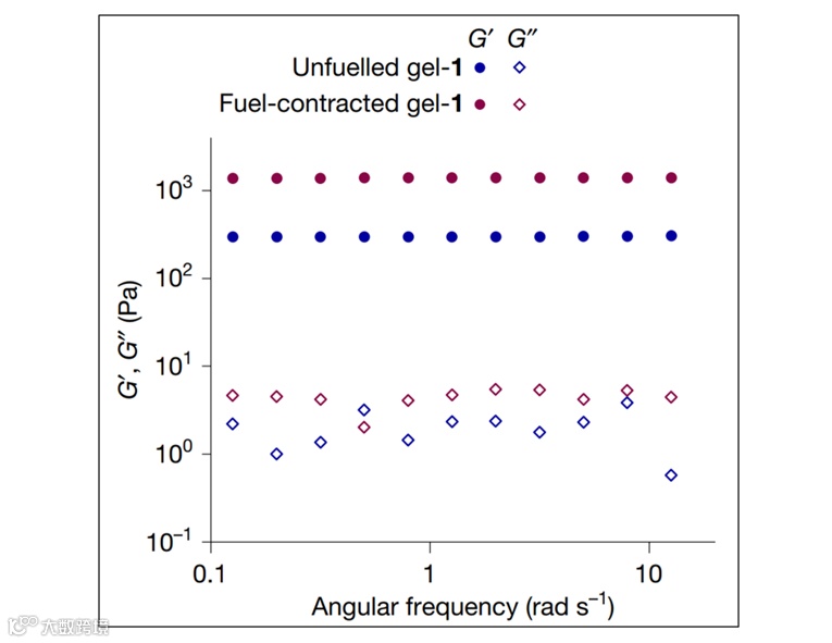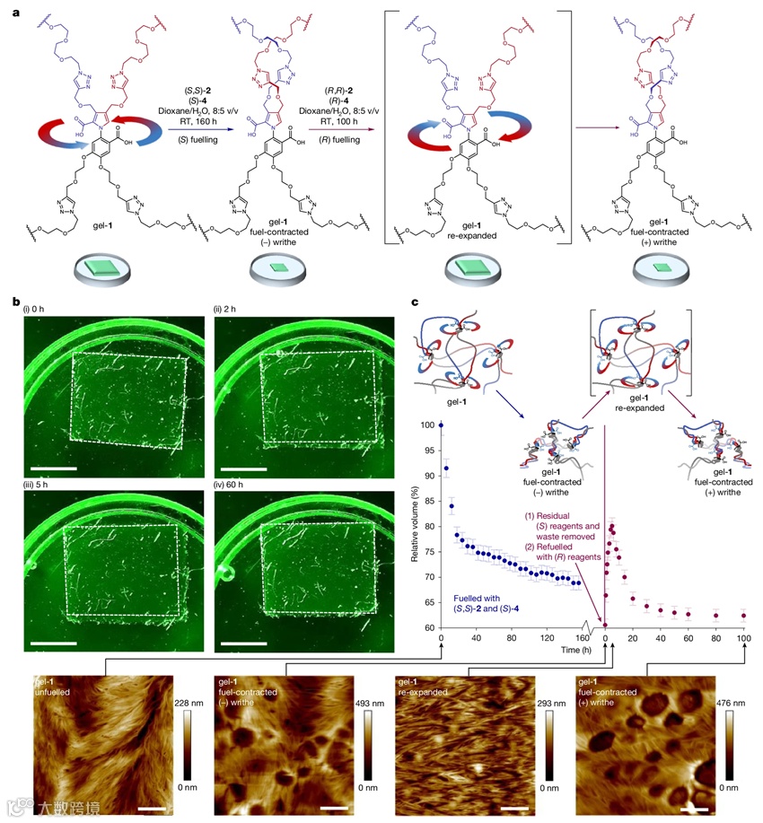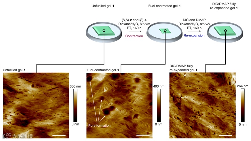 图5. 化学燃料驱动预收缩凝胶的膨胀到再收缩。