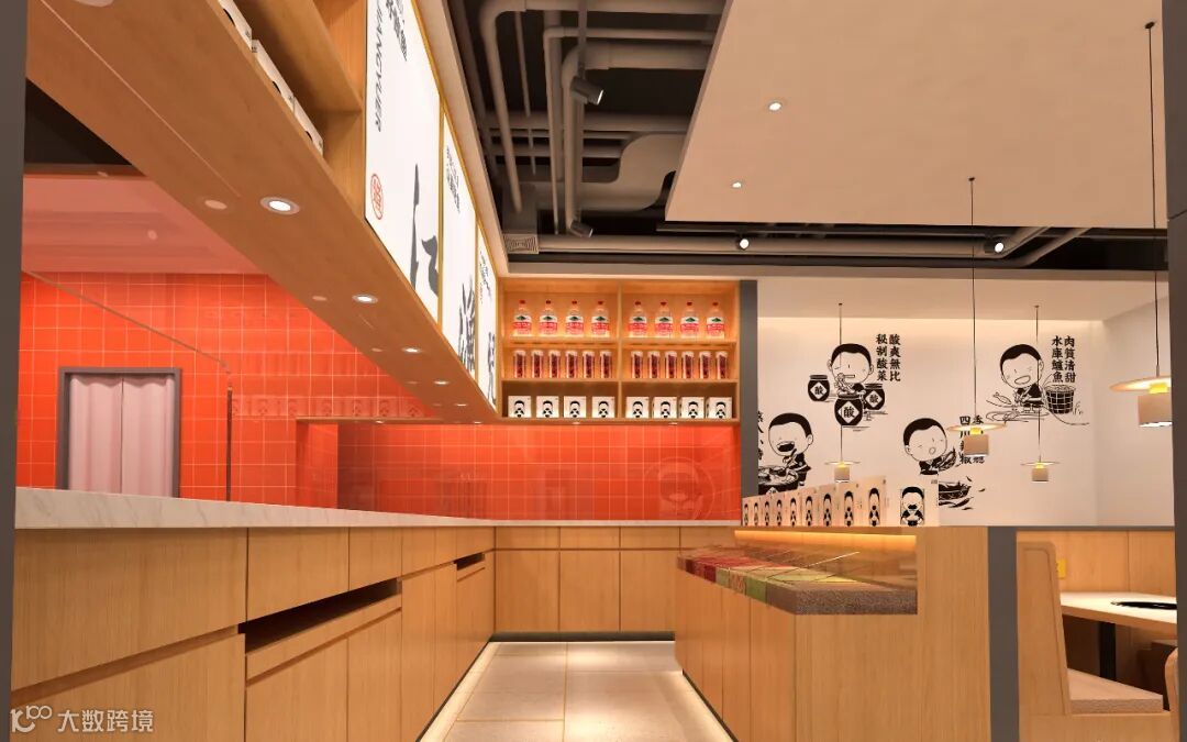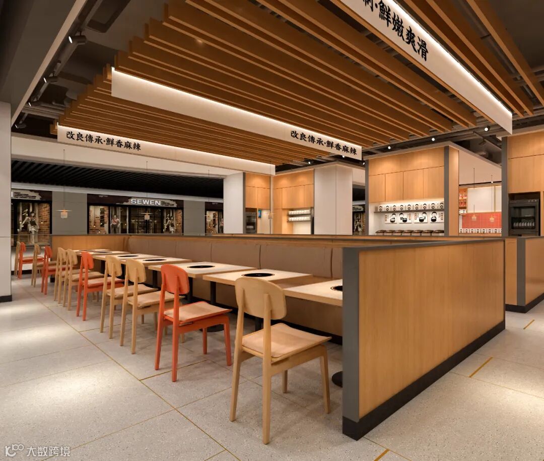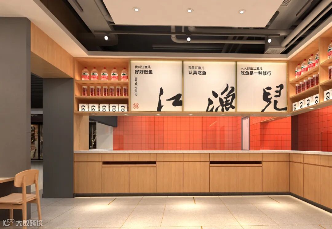 不同于其他酸菜鱼餐厅中式硬朗、厚重的装修风格,江渔儿3.0版本门店选择“打开家门”,把餐厅的所有隔断打通,以开放式设计让门店的呈现变得更为通透。
