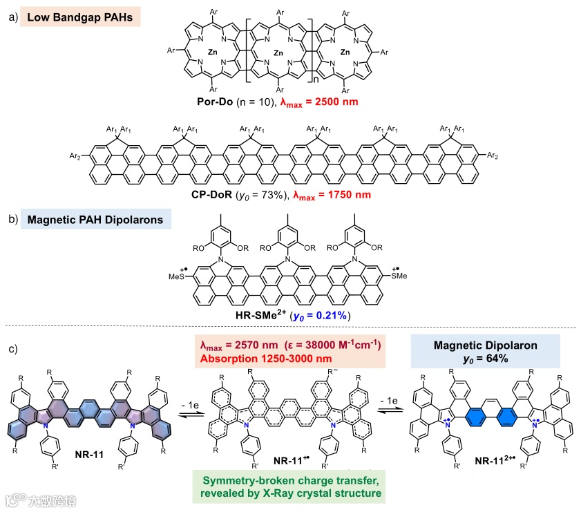 和宽度(如图1a所示)或将中性分子转变为离子自由基来减小其能带隙。然而,即便如此,具有极低能带隙和潜在金属特性的稠环芳烃依旧为数不多。