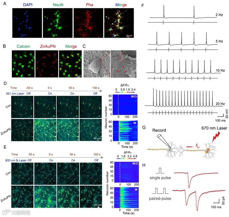 图2. 纳米光电极ZnAuPN高时空分辨调控单个神经元