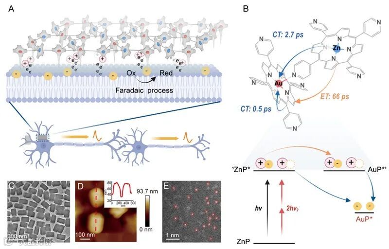 受光合细菌光能转换机理的启发,研究人员采用离子交换新策略,将ZnTPyP中的部分锌离子替换为金单原子,构建了p-n双分子金属卟啉体异质结(ZnAuPN)。利用瞬态吸收光谱,系统揭示了ZnAuPN的独特电荷转移机制。该结构展现出超快的分子间能量转移速率(~ 66 ps)和分子内电荷转移速率(~ 0.5 ps),实现了高达97%的光诱导电荷分离和传递效率,最终将电子有效传递至金卟啉的金原子中心,形成富电子的单原子金电极阵列。这些高活性的金原子可通过法拉第机制将电荷高效注入神经组织,实现了单个神经元的高时空分辨率调控。在激光照射下,单个神经元的电荷注入高达~4 pC,实现了亚毫秒