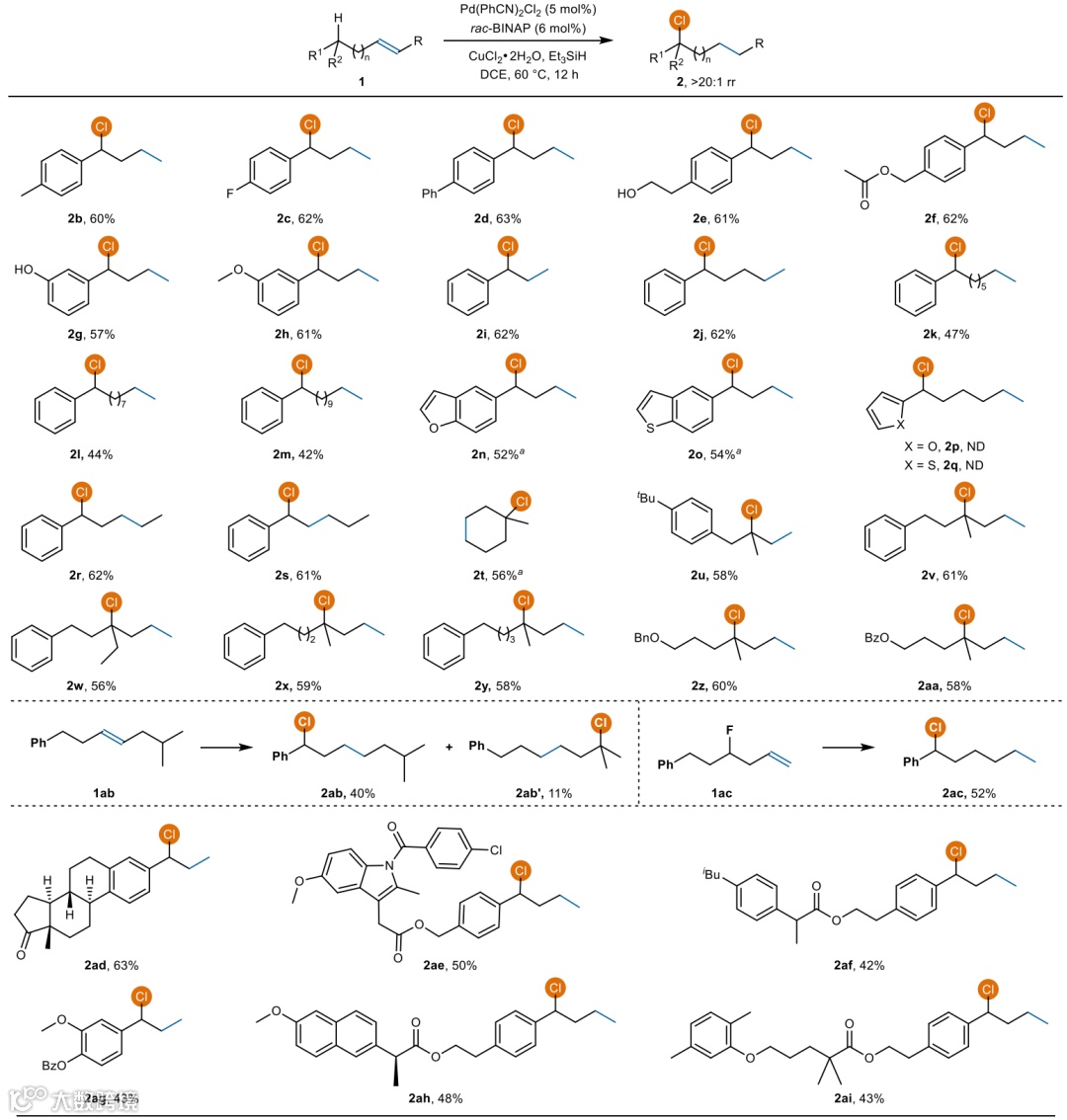 ),也适用于该反应。羟基、酯、酰胺和羰基等在该反应中具有良好的耐受性。总体而言,这些结果表明首次通过烯烃迁移氢氯化实现了远程内部C(s