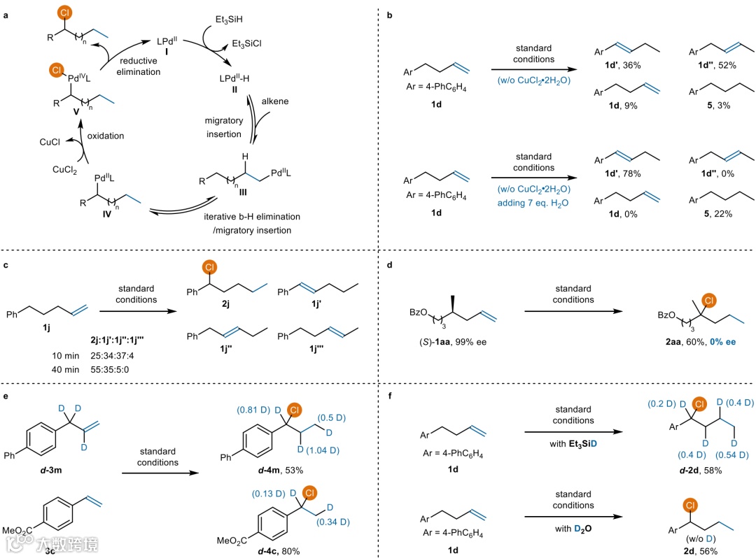 中检测到氘,为Pd–H物种从烯烃中解离提供了额外的证据(图 3e)。此外,氘代硅烷同位素标记实验结果显示,在所有亚甲基上都观察到了氘,表明Pd–H物种确实沿着烯烃的碳链迁移(图2f)。当使用D