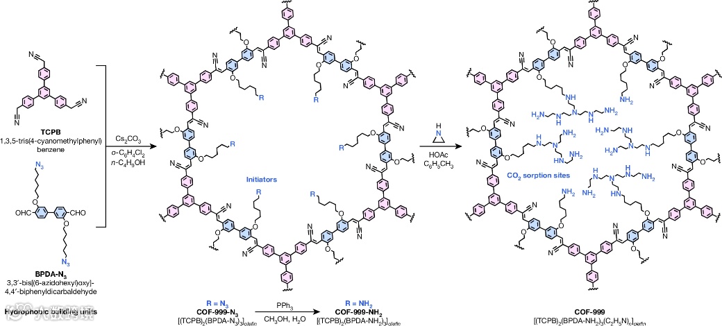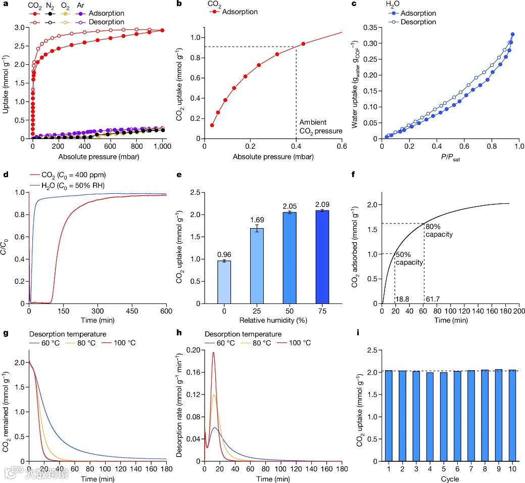 “从空气中捕获CO2是一个非常具有挑战性的课题,需要一种具备高CO2容量、高选择性、耐水、抗氧化、可回收,并且再生温度较低的材料。” Yaghi表示,“目前通常使用胺溶液,但这种方法能耗较高,吸收CO2后需大量能量加热再生”,“我们设计的COF不仅具有优异的化学和热稳定性,在100次循环后容量几乎无损,能够直接从空气中捕获CO2。仅200克材料,一年就可以吸收20公斤的CO2。据我所知,目前还没有其他材料能达到同样的效果”。[1] 原文(扫描或长按二维码,识别后直达原文页面):Carbon dioxide capture from open air using covalent organic frameworksZihui Zhou, Tianqiong Ma, Heyang Zhang, Saumil Chheda, Haozhe Li, Kaiyu Wang, Sebastian Ehrling, Raynald Giovine, Chuanshuai Li, Ali H. Alawadhi, Marwan M. Abduljawad, Majed O. Alawad, Laura Gagliardi, Joachim Sauer & Omar M. YaghiNature, 2024, 635, 96-101. DOI: 10.1038/s41586-024-08080-x 参考文献:[1] Capturing carbon from the air just got easierhttps://news.berkeley.edu/2024/10/23/capturing-carbon-from-the-air-just-got-easier/[2] H. Lyu, et al., Carbon Dioxide Capture Chemistry of Amino Acid Functionalized Metal–Organic Frameworks in Humid Flue Gas. J. Am. Chem. Soc. 2022, 144, 2387-2396. DOI: 10.1021/jacs.1c13368 (本文由小希供稿)