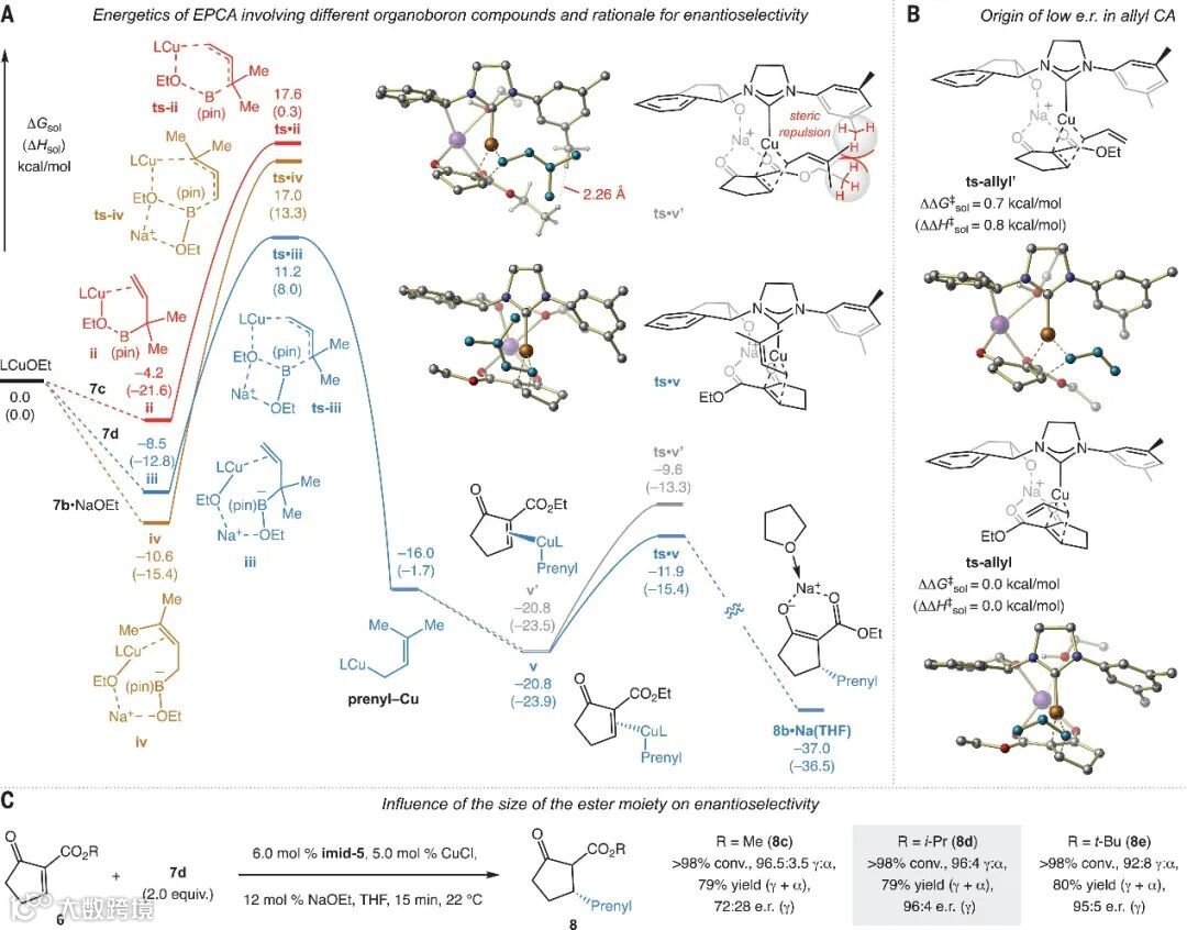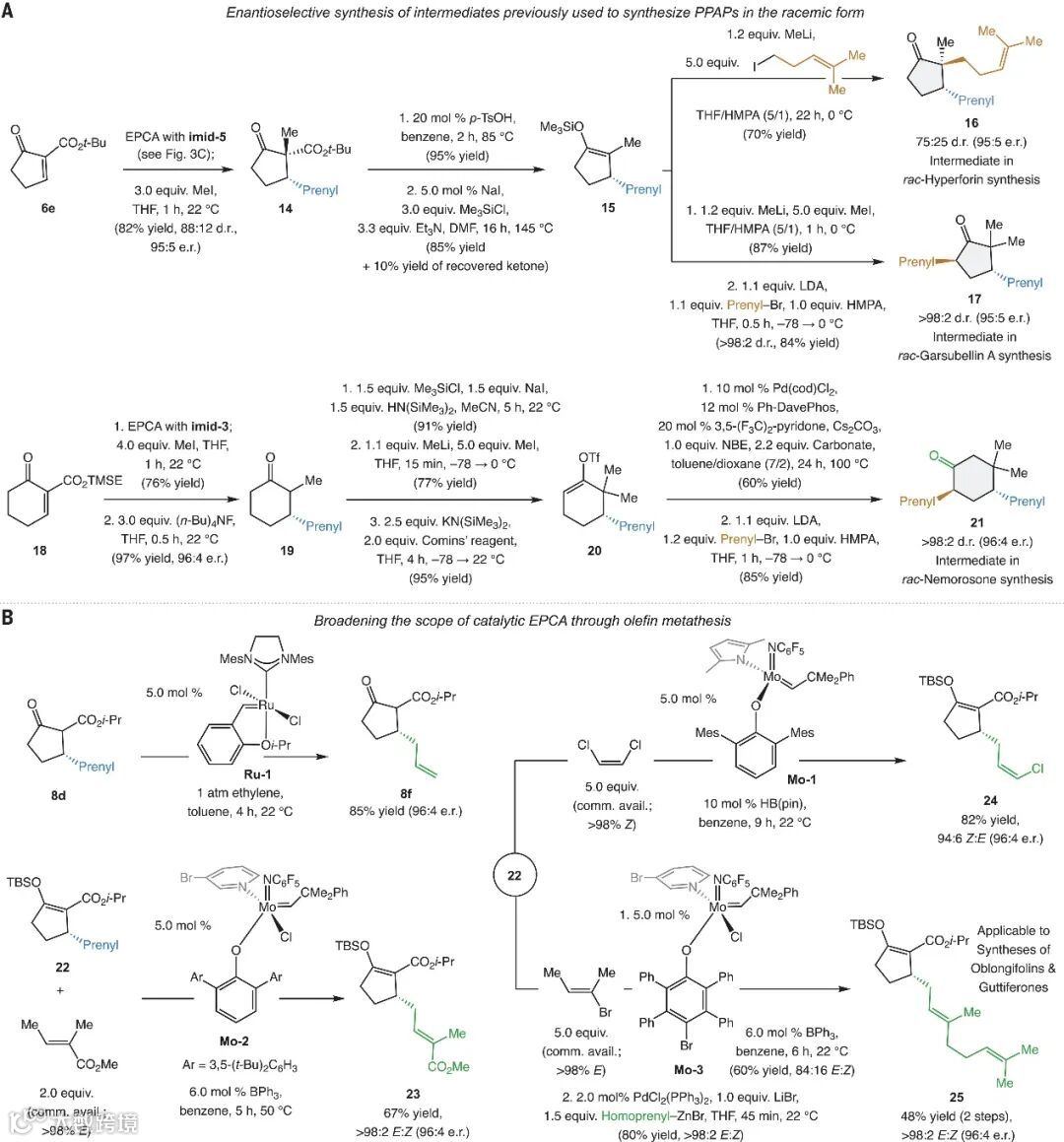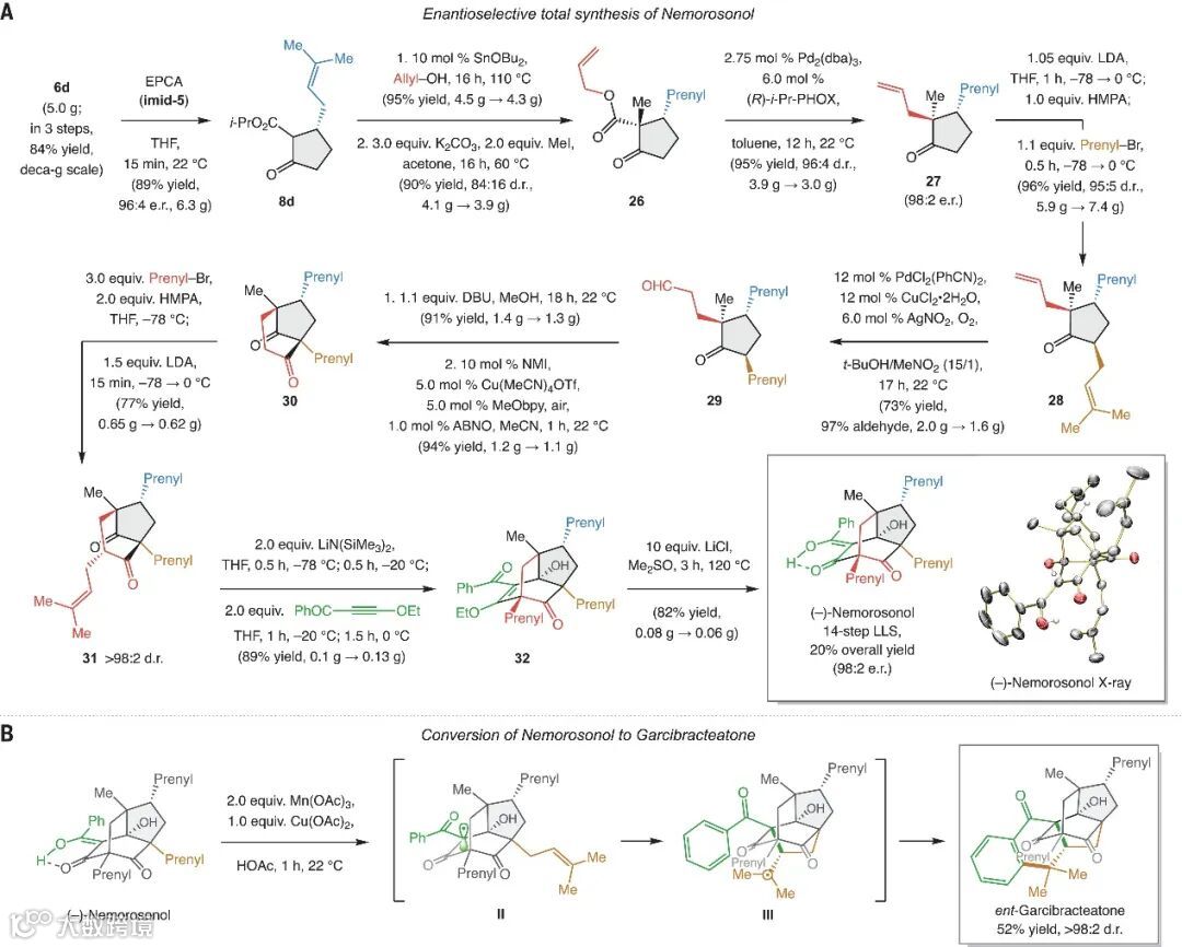 为了展示该方法的实用性,作者利用此方法对映选择性合成nemorosonol(图5A),即6d(5g规模)经EPCA反应、酯交换、α-甲基化、对映体纯Pd配合物催化的脱羧反应、在LDA的作用下与异戊烯基溴反应、Grubbs改良的Wacker氧化、分子内aldol加成反应、催化有氧氧化、在LDA的作用下与异戊烯基溴反应、Michael加成/羟醛环化序列、在120°C和DMSO中用过量LiCl处理后,最终以14步LLS、20%的总产率和98:2 e.r.值实现了(-)-nemorosonol的全合成。虽然上述全合成与报道的外消旋合成路线步骤相似,但是本方案的产率(20% vs 0.7%)和对映选择性(98:2 e.r.)更高。最后,作者通过芳基自由基/芳构化序列(即经自由基中间体II和III)将(-)-nemorosonol一步法转化为 ent-garcibracteatone(产率:52%,图5B)。