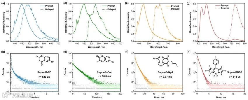 作者接下来选用了BrTO、BrCou、BrNpA、I2BDP等8种常见的磷光基团,合成了相应的磷光基元,并分别与骨架基元共组装,得到Supra-BrTO、Supra-Cou、Supra-BrNpA、Supra-I2BDP等超分子组装体(图3)。它们均表现出显著的磷光发射,且磷光发射波长和磷光寿命各异,充分证明了该超分子策略不依赖磷光基团本身的性质,展现出良好的普适性。