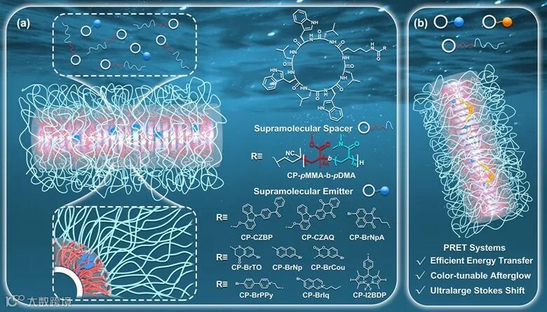 , 2401346),他们针对磷光基团所需的刚性环境,对基于自组装环肽的超分子骨架进行了优化设计,采用了环肽-聚甲基丙烯酸甲酯-聚