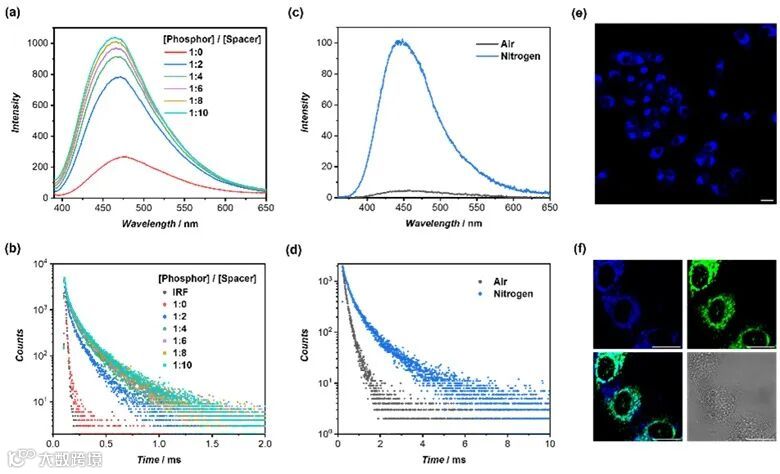 DMA以一定比例在水中共组装,即可得到组装体Supra-CZBP。随着骨架基元比例的增加,Supra-CZBP的发射强度逐渐增强,发光寿命也随之延长。在氮气氛围的保护下,发光强度提升了22倍,发光寿命也延长至755.8 μs,这些结果证实了水相室温磷光材料的成功构筑。