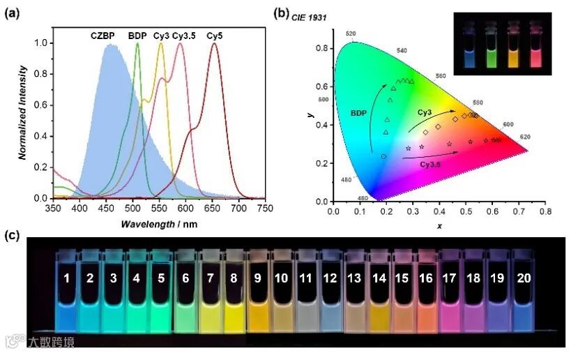转移(PRET)体系。以Supra-CZBP/CP-Cy3为例,随着能量受体CP-Cy3比例的增加,溶液的发光颜色逐渐由蓝色变为橙色。同时Cy3的荧光发射表现出较长的寿命(空气-24.6 μs,氮气-111.3 μs)。值得一提的是,该PRET体系展现出优异的性能,能量转移效率高达91.7%,且发光量子产率相比于Supra-CZBP也有3倍的提升。在此基础上,作者进一步拓展了PRET体系,通过选择不同的能量受体,成功构筑了发光颜色可调的长余辉体系(图4),其中能量转移效率均超过80%,发光量子产率介于6.1%-30.7%之间。此外,作者还构筑了具有两次连续能量转移过程的PRET体系,成功实现了高达450 nm的表观斯托克斯位移和82.7%的能量转移效率。