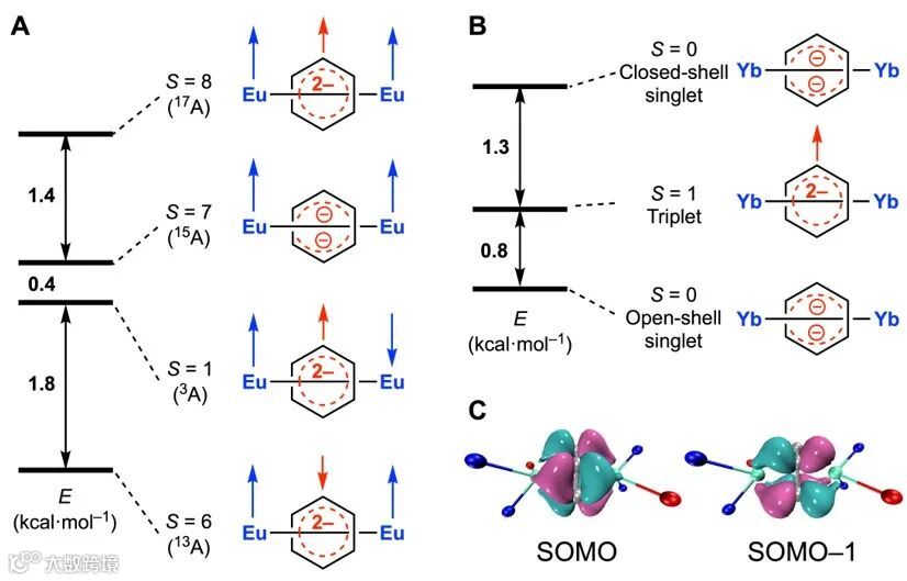 图4. 2-Yb、2-Eu和3-Eu的DFT计算结果(A)2-Eu不同自旋多重态的相对能量;(B)2-Yb不同自旋多重态的相对能量;(C)2-Eu(13A)的δ成键轨道