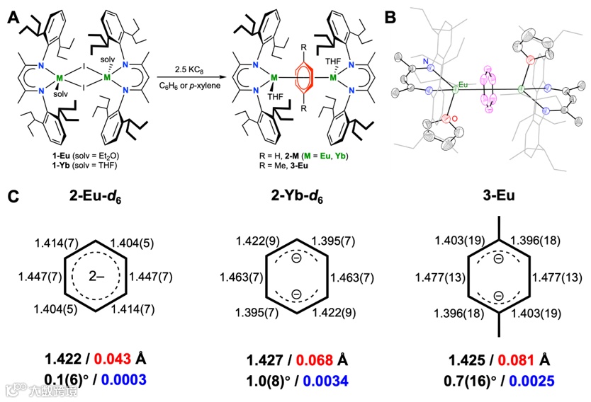 自Baird提出三重态芳香性概念半个世纪以后,具有三重态基态和Baird芳香性的苯二负离子终被合成。本工作利用d−π* δ成键与4f−rad自旋−自旋相互作用的协同效应克服了极易发生的Jahn−Teller畸变,实现了高度平面化的三重态苯二负离子的稳定。该结果为拓展具有基态Baird芳香性的分子提供了指引,并例证了利用稀土离子进行自旋调制的有效性,为开发基于自旋调控的新型功能材料和器件奠定了基础。