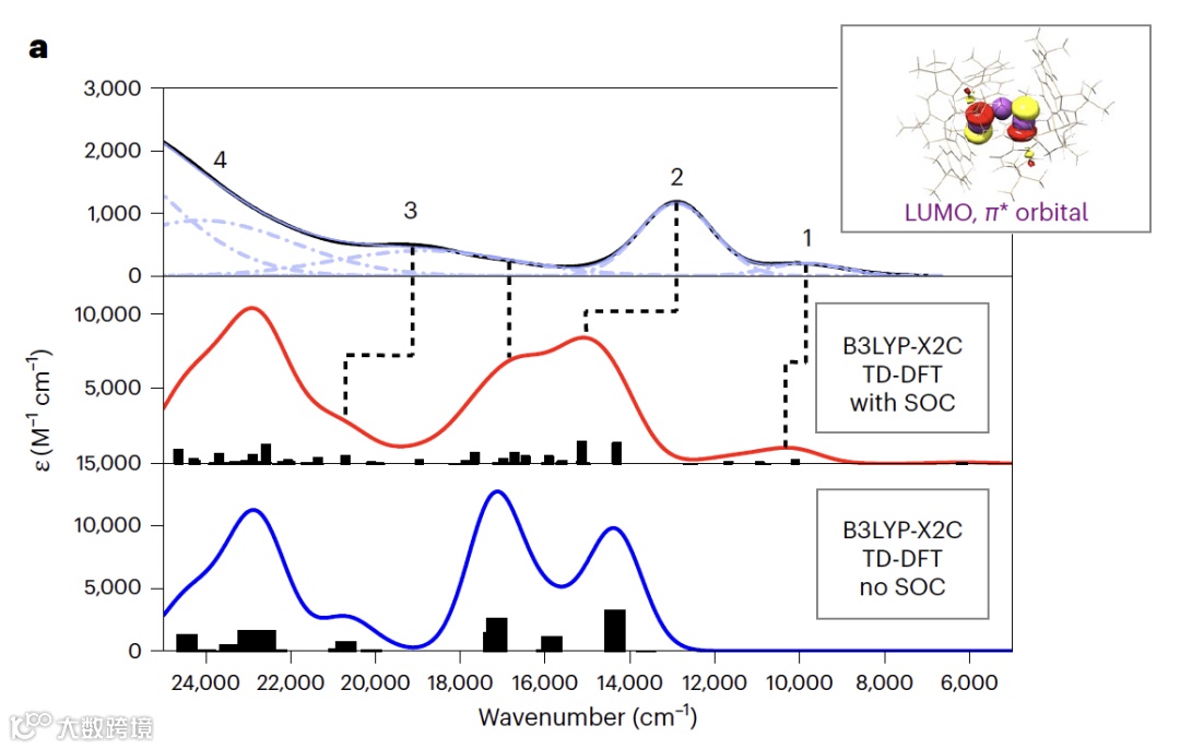 处的主吸收峰2和3则是由单线态向单线态跃迁主导的。有意思的是,所有跃迁都涉及同一个受体轨道,即