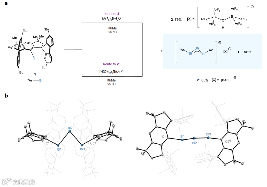 导读:德国马克斯普朗克煤炭研究所的Josep Cornella课题组以铋宾1为起始原料,合成并表征了由三个连续铋宾中心构成的化合物2和2’,其可被视为由最重稳定元素组成的烯丙基阳离子类似物