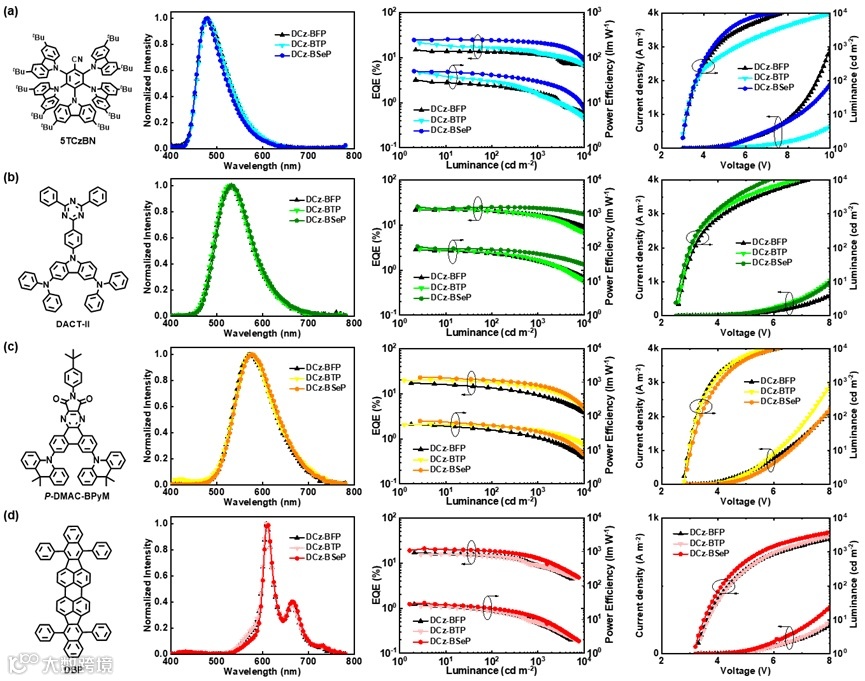 OLED测试结果表明(Figure 4),以DCz-BSeP为主体材料制备的红绿蓝三基色TADF-OLEDs,相较于基于DCz-BFP和DCz-BTP的器件,均表现出更高的效率和更低的效率滚降。该材料在窄光谱红光超敏荧光OLED和磷光OLED中的拓展应用,进一步验证了主体材料中的硒掺杂策略在OLED中的普适性和应用前景,为未来OLED主体材料的开发提供了新的设计思路和方向。