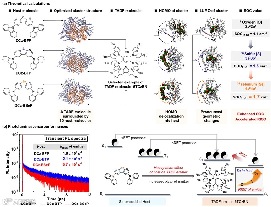 Figure 3. (a) Molecular design of the selenium-doped host molecules: Theoretical calculations on the host-guest clusters comprising a well-documented TADF molecule 5TCzBN and 10 surrounding host molecules. (b) Transient PL spectra at 298 K of 5TCzBN TADF emitter-based films in DCz-BFP, DCz-BTP or DCz-BSeP host and the corresponding energy transfer diagram of 5TCzBN-doped DCz-BSeP film.