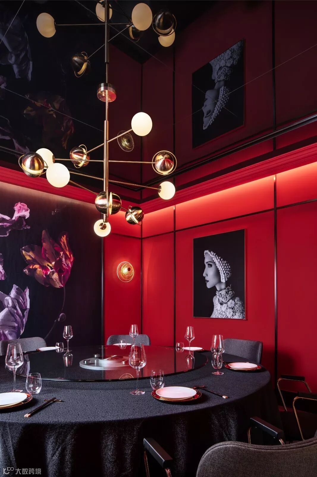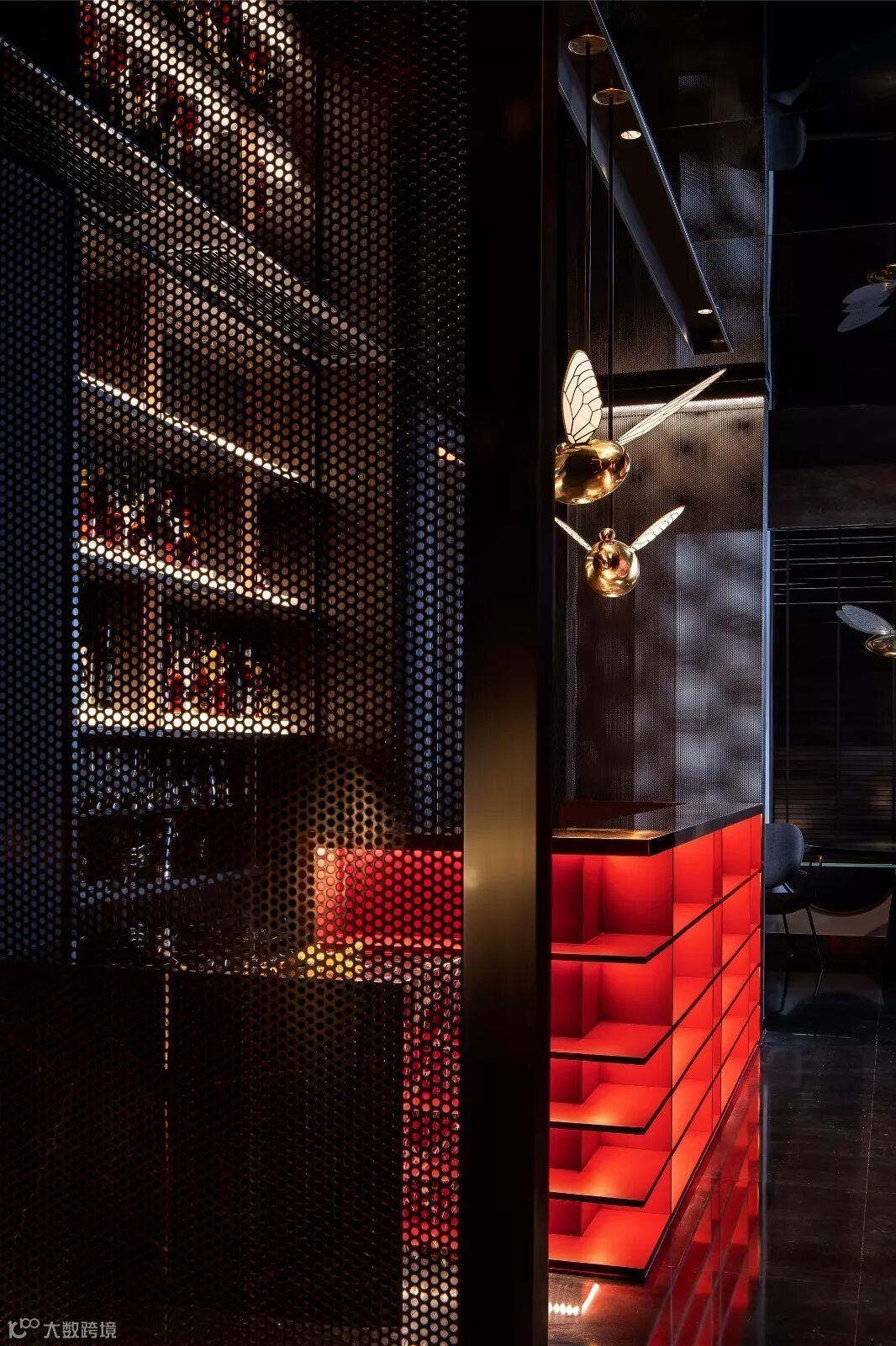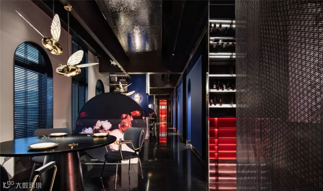 餐饮空间的设计需为客户人带来最佳的空间体验,稳固客户群体,确保后续消费力。设计师梳理客群定位后将空间合理分化,保证空间舒适度,流线顺畅度。在此基础上最大程度的赋予空间自由度,发挥空间最大效益,半开放、私密空间满足不同客户的就餐需求。不同的主题包房顺应空间结构分位罗列,每一间都着视觉冲击感,同时又拥有绝对的安静与隐私度,让人沉浸其中。而在半开放空间。为保持开放空间的相对私密性,设计师在相邻座椅间加入圆形的可活动隔墙,同样能满足平日招待就餐客户的基本空间需求。