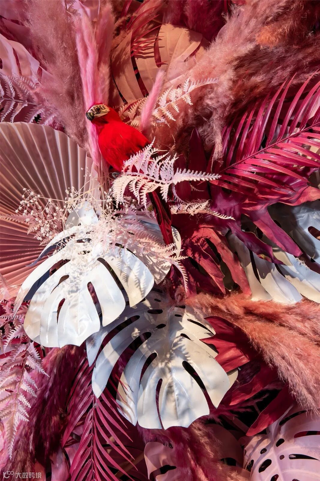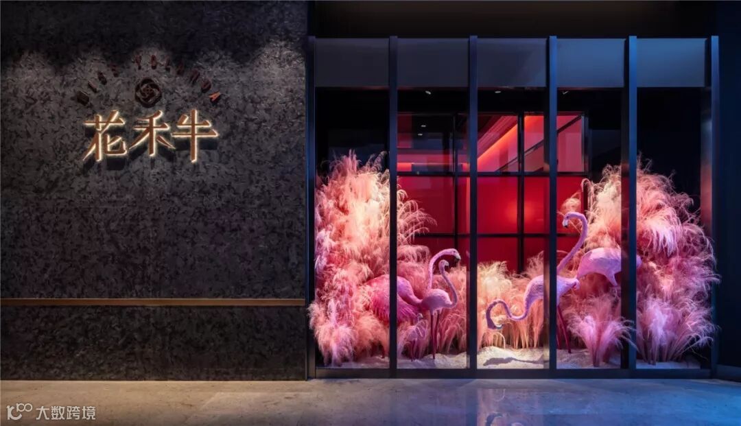 餐厅给客户呈现的首先是环境,它代表客户的第一印象。“花”元素的直观形态,在空间必不可少,设计师将其作为空间亮点设置在门店外侧,直观地将餐厅标志立于人前。同时背景墙挡住室内空间,未全然展示店内空间,为客人留些许想象空间,激发探索欲。花艺展示造型醒目,自然成为路人话题,建设吸引点,极大的增加访客基数量,进而提高如入店消费客流量。同时能够增强大众对花禾牛的品牌印象,还便于传播花店品牌形象,增大宣传范围,产生联合品牌效益,增加客户黏度。以花为装饰,呼应空间要素,最终完成门面品牌打造的任务。