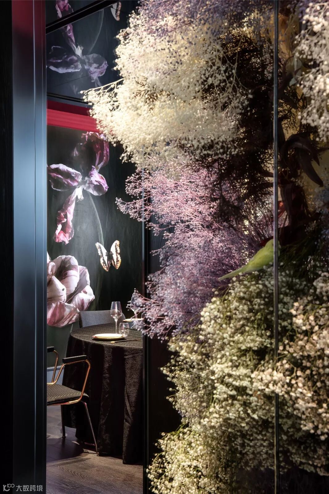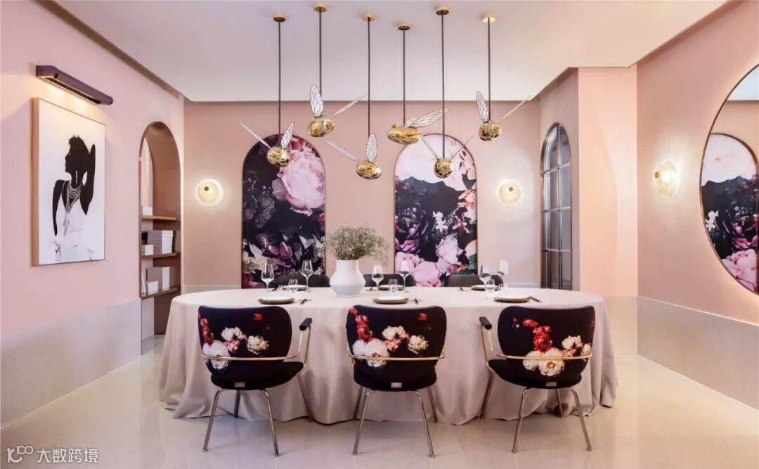 Gary善于梳理品牌消费群体的产品定位,从而呈现出品牌的专属个性。功能布局合理化,空间功能分化是设计的基础,以满足视觉舒适及功能实用为首。设计师先将空间功能整合,划分为:花房、入口接待区、打卡景观区、包房、开放餐区、卫生间及后勤区。其次建立产业风格,随着经济的快速发展,饮食活动中的空间体验感占据越来越重的位置,设计师力求在有限的预算内给客户带来最好情景体验感。花禾牛以花艺、经典、时尚为要素,立点寻设意。“花”为主要元素贯穿整个空间,增强品牌形象。