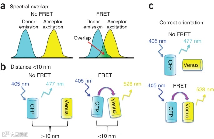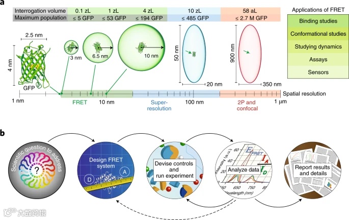 上世纪40年代,德国化学家Theodor Förster发表了一系列论文,阐明了共振能量转移机理。他发现处于激发态的供体生色团能够通过非辐射的方式,将能量转移到受体生色团。为了纪念Förster,这种机理被命名为FRET(Förster resonance energy transfer)。此后,FRET显微技术成为探测纳米尺度下蛋白质或其他生物大分子长度的唯一光学方法,因此FRET显微技术也被称为“分子标尺”,为生命科学提供关键的表征和实验证据。