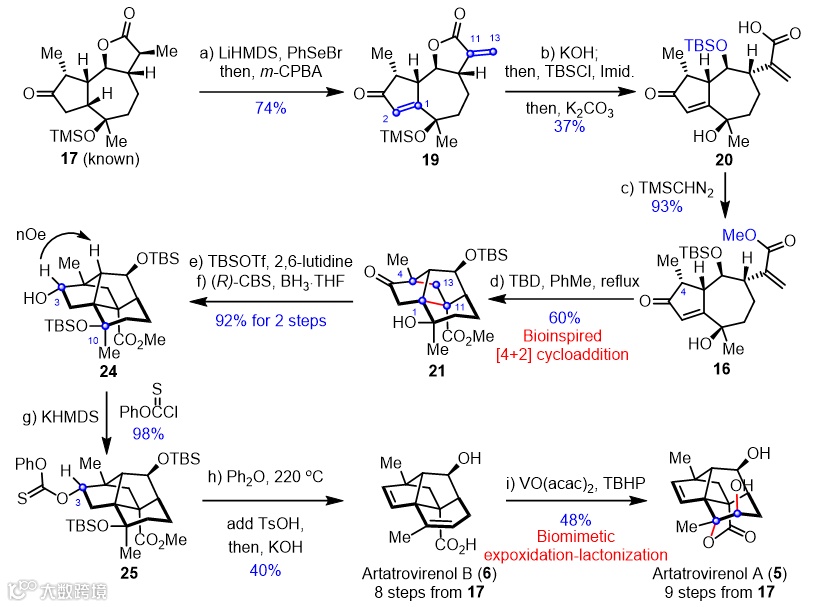 从简单易得的具有愈创木烷型的骨架前体17出发,以8步(最长线性路线)完成了artatrovirenol B的首次不对称全合成