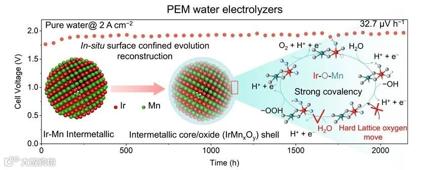 图1. Ir-Mn金属间化合物原位受限演变机理及电解槽性能示意图