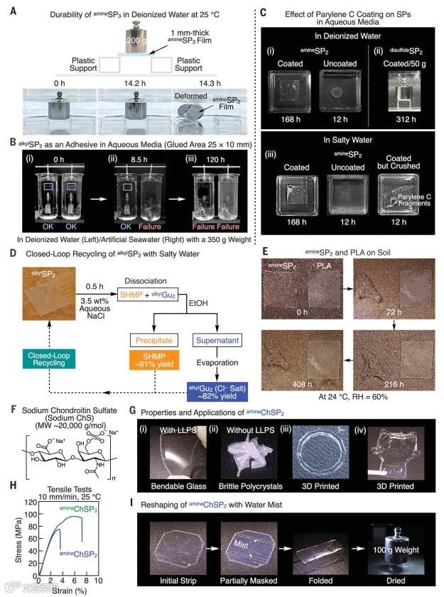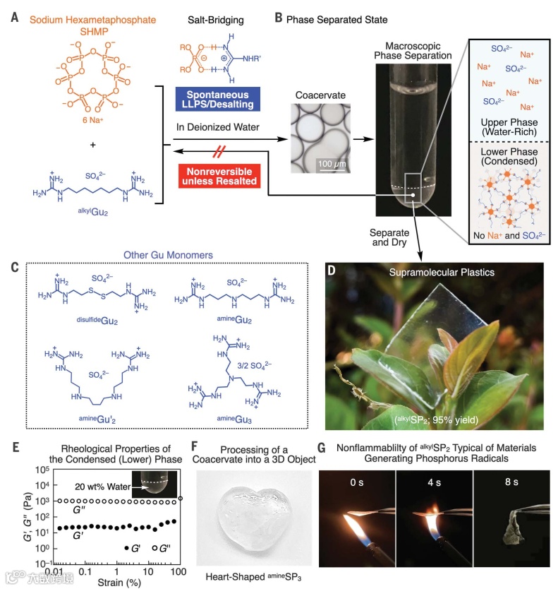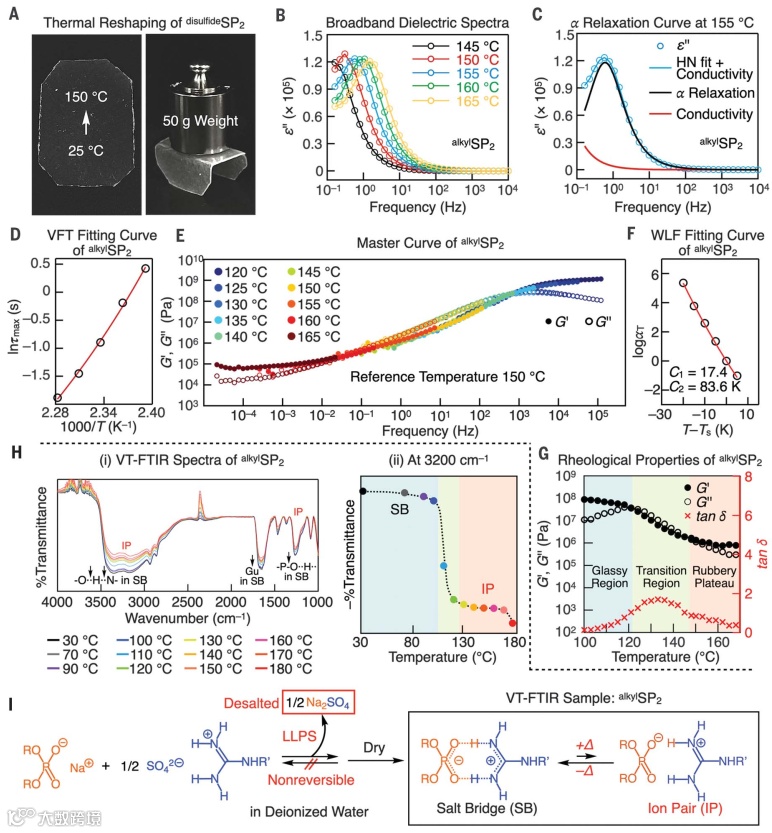 当SHMP和alkylGu2(SO42-盐)以2/3或0.5/3的非化学计量摩尔比混合时,NMR光谱观察到SHMP或alkylGu2与其对应物一起过量存在,这表明HMP和alkylGu2之间的3D交联网络通过LLPS形成凝聚液相,并且凝聚层对外部添加的电解质高度敏感。另外,作者发现HMP和Gu单体在水中的交联伴随着LLPS,LLPS形成凝聚层并最终形成凝聚液相,因此能够从这些单体创建SPs。事实上,干燥该凝聚液相会产生机械强度高的玻璃态塑料材料SPs(图1D),而且在此LLPS过程中两种离子单体的原始无机抗衡离子(Na+和SO42-)会从凝聚液相转移到富水相。需要指出的是,与LLPS相关的脱盐过程是HMP和Gu单体之间的非共价交联稳定的关键。如果不脱盐,那么干燥的残留物呈结晶状且易碎。其次,将凝聚液相蒸发至干燥并热压便可得到无色玻璃状薄膜固体alkylSP2(图1D),密度高达1.62 g cm-3、透光率高达97%(与聚(甲基丙烯酸甲酯)相当)。相比之下,缺乏LLPS会形成结晶粉末而非无定形薄膜,若用模具处理凝聚层,然后干燥便可创建心形3D物体(图1F)。此外,作者还对SPs的物理性质和弛豫行为进行了研究(图3),发现盐桥和离子对分别是观察到玻璃态和橡胶态区域的主要原因,并且与共价热固性聚合物类似,SPs可以在高于其Tg时进行热重塑。