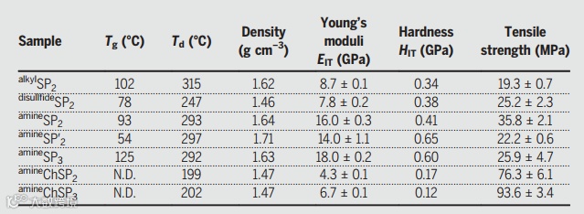 如图4所示,将HMP与其它Gu单体结合时也会产生高密度材料:disulfideSP2(1.46 g cm-3)、amineSP2(1.64 g cm-3)、amineSP'2(1.71 g cm-3)和amineSP3(1.63 g cm-3),而且结合电感耦合等离子体原子发射光谱(ICP-AES)和能量色散X-射线光谱,作者确认SPs中Na+和SO42-的含量可忽略不计,进而说明LLPS期间确实发生了脱盐。其次,alkylSP2由于磷含量高不易燃,TGA显示alkylSP2在315 °C时重量损失5%,并且在100°C加热14天后仍保留其原始机械性能,这表明其具有较高的热稳定性,disulfideSP2(247°C)、amineSP2(293°C)、amineSP'2(297°C)和amineSP3(292°C)也观察到类似的结果。第二次加热时,alkylSP2的差示扫描量热法(DSC)显示在102 °C时仅出现一个由玻璃化转变引起的阶跃,同时 disulfideSP2、amineSP2、amineSP′2和amineSP3的Tg值分别为78、92、54和135 °C,这表明所有开发的SPs都是无定形的并且在室温下呈玻璃状。值得一提的是,压痕试验显示本文的SPs明显高于传统热固性聚合物的杨氏模量EIT值,同时拉伸测试显示拉伸强度范围为19.3-35.8 MPa。
