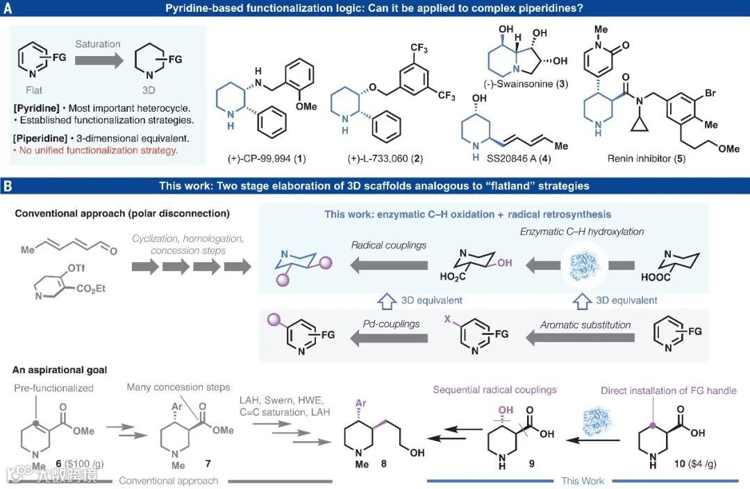 从FDA批准上市的药物以及现代医学的角度来看,吡啶及其苯并环化类似物是最重要的杂环化合物结构。如图1A所示,这些平面二维(2D)结构通过一系列顺序官能团化(如:卤化、硼化)以及过渡金属介导的交叉偶联反应来实现多样化。近年来,复杂哌啶(即吡啶的完全饱和类似物)在药物研发过程中受到广泛关注,这也与当前药物发现的重点逐渐转向拓扑更复杂的3D空间有关。事实上,多取代哌啶是药物先导化合物和天然产物中最常见的结构单元(如:1-5),其中二取代哌啶占目前含哌啶药物的61%,但是此类骨架的精确立体化学控制、模块化的合成仍极具挑战性。虽然考虑了立体化学因素,但是此类化合物的逆合成主要依赖于极性键断裂(图1B),这依赖于羰基和烯烃化学,并且往往会受到官能团(FG)、保护基(PG)和氧化还原操作的影响。另一方面,定向进化技术促进的酶促C-H键氧化已被认为是在未活化Csp3-H键上位点特异性安装官能团的最有效方法之一。从某种程度上来说,这种酶促策略有些类似于吡啶上一些常规的经过验证的功能化策略,比如亲电芳香取代。最近,化学家利用自由基交叉偶联策略成功地偶联常见的含Csp3官能团(如酸和醇),这类似于在吡啶上发生Suzuki及相关偶联。那么,酶促C-H键氧化与自由基交叉偶联这两种策略能否“双剑合璧”,产生1+1>2的神奇效果呢?