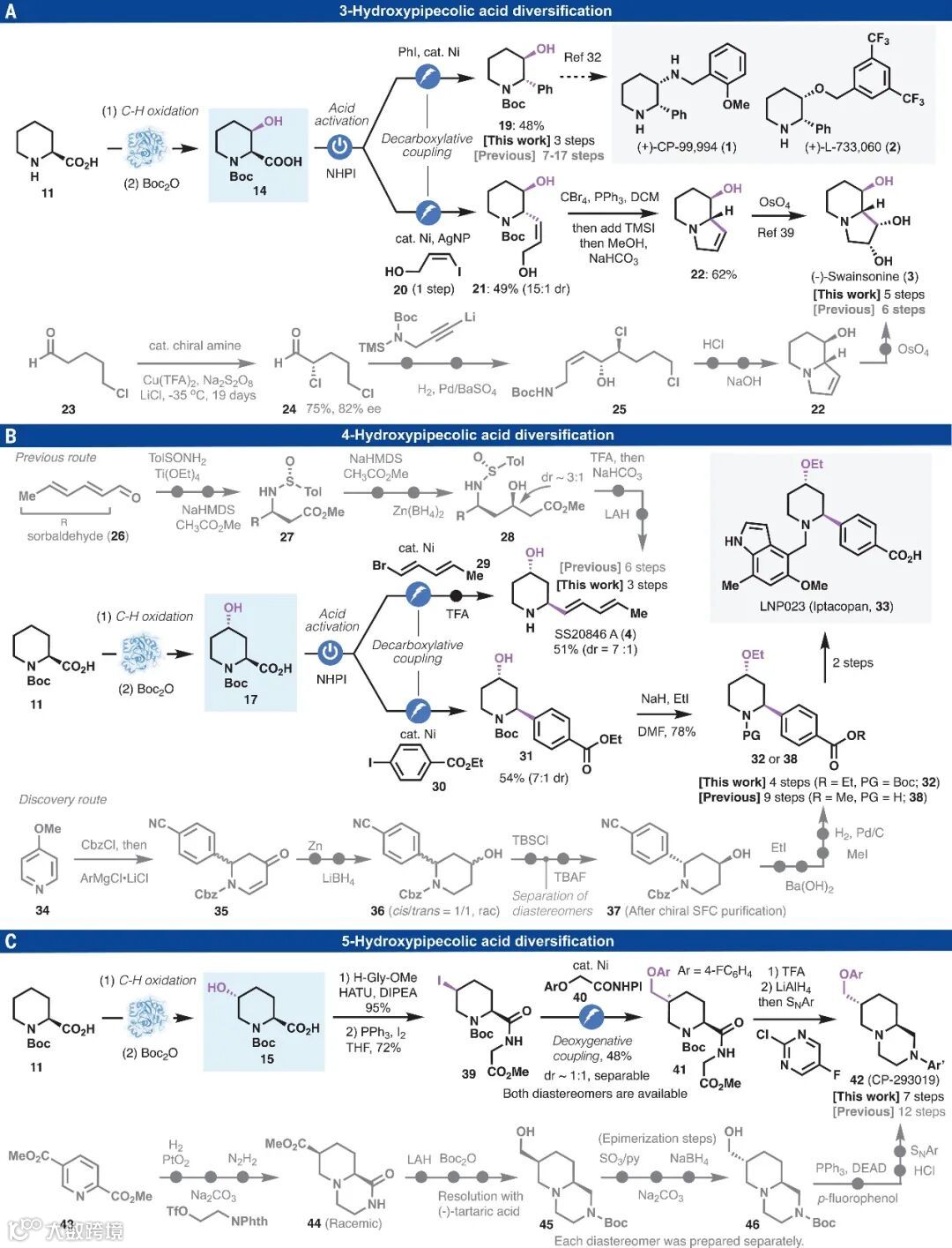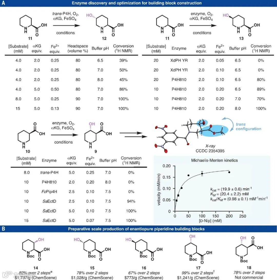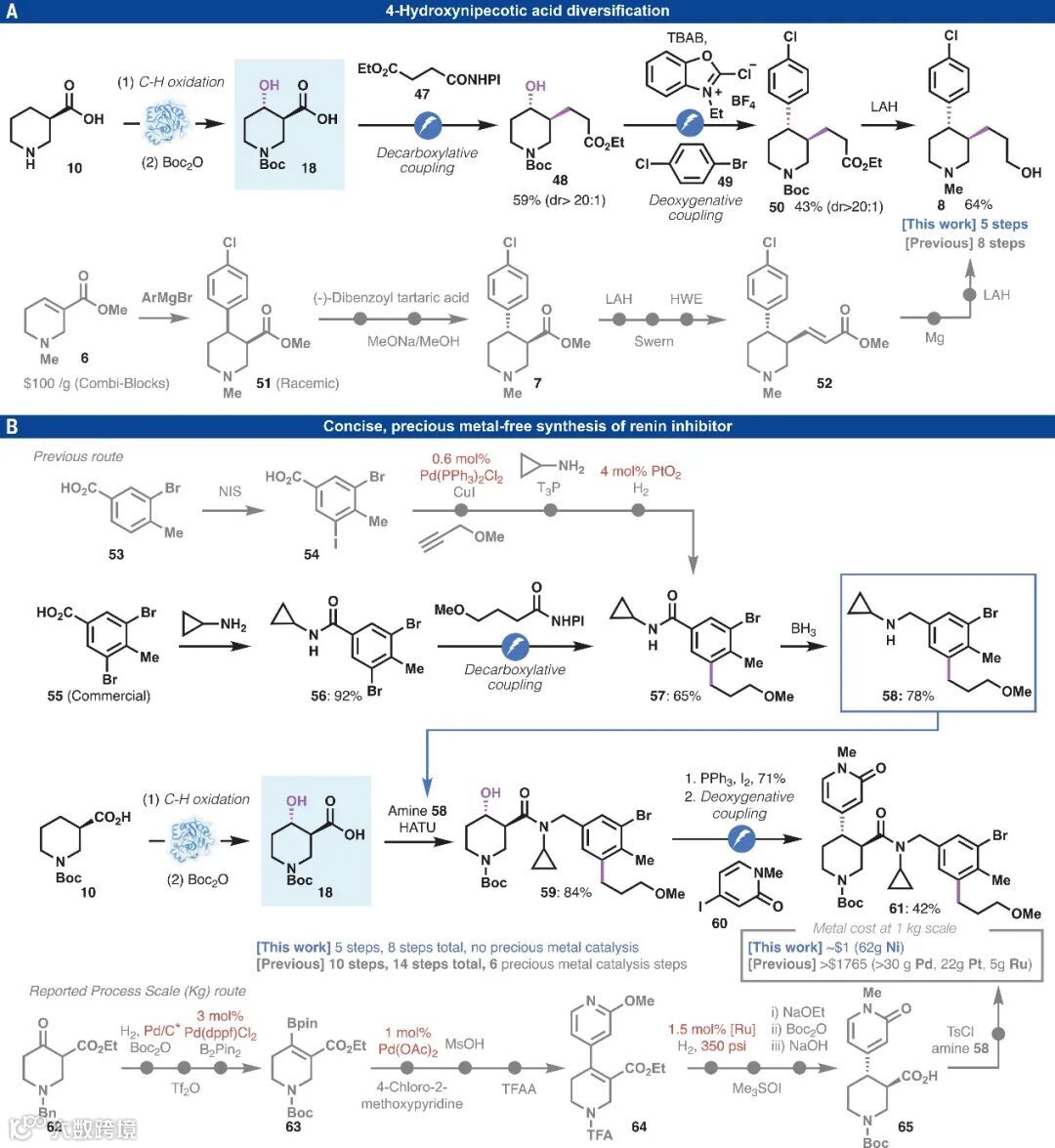 近日,美国斯克利普斯研究所(Scripps Research)的Phil S. Baran、Yu Kawamata和莱斯大学的 Hans Renata等研究者利用生物催化C-H键氧化和自由基交叉偶联相结合策略(图1B),成功地发展了一种快速、模块化、对映特异性和非对映选择性官能团化哌啶的方法,从而极大地简化了大量高价值手性哌啶的合成路线。以3,4-二取代哌啶8为例,作者通过生物催化C-H键氧化和两次连续的自由基交叉偶联反应即可获得,而先前的方法则需要8步合成并且涉及手性拆分、自燃性试剂使用(Grignard、LAH×2)和多次氧化还原操作。相关成果发表在Science 上。