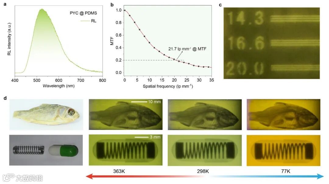 另外,鉴于闪烁体温度自适应的特征,探索了闪烁体在不同温度下的X射线辐射成像,其最高成像空间分辨率可达21.7 lp m