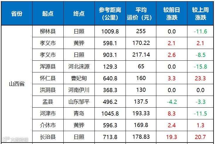 【山西省】周末山西地区运价大部上涨,幅度在2-19元/吨之间。