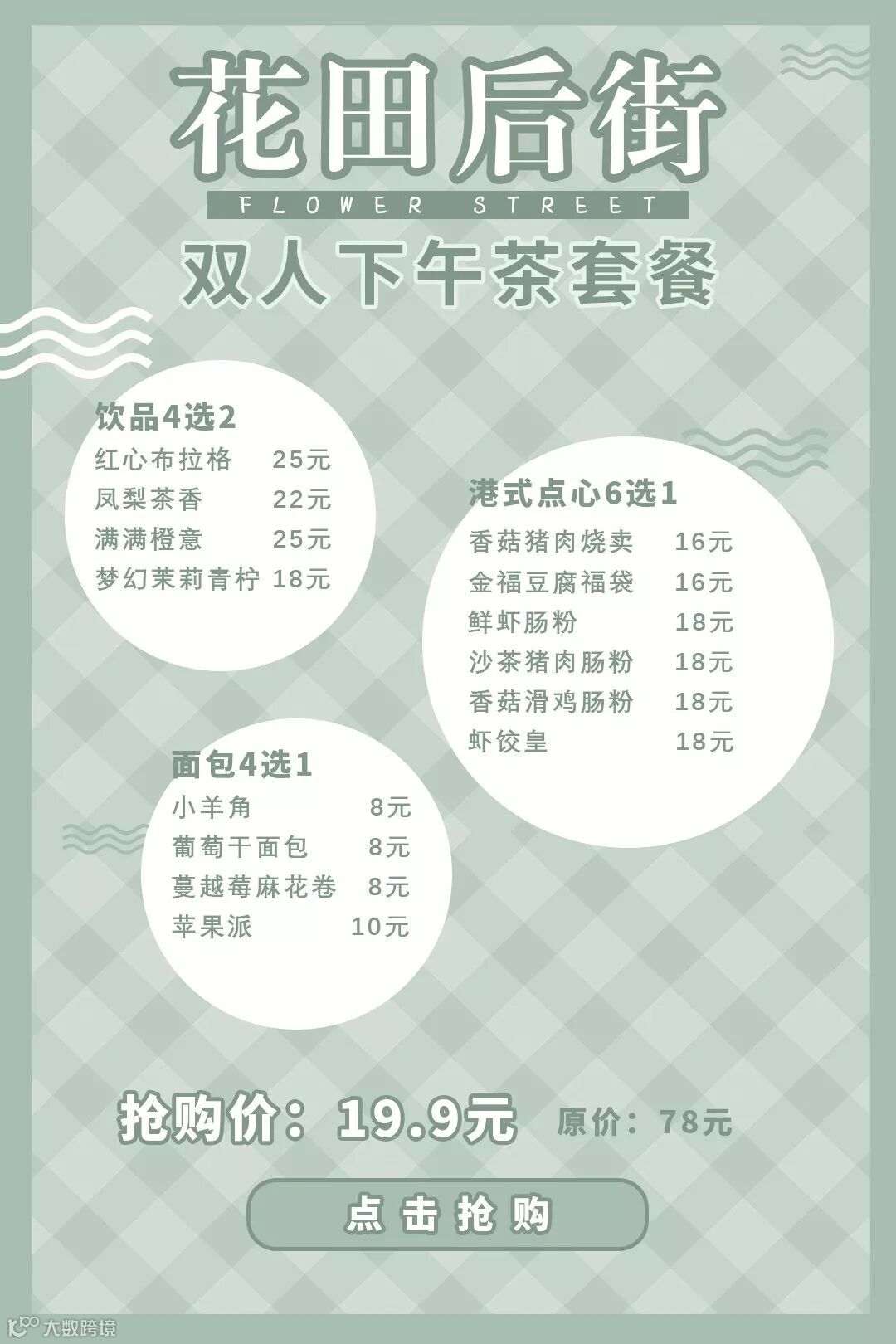 现在还有超值双人下午茶套餐,秒杀价19.9元,限量100份,拼手速的时候到了!