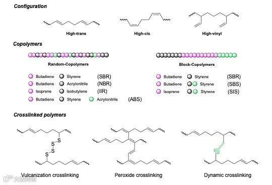 全球每年产生数百万吨聚二烯废弃物,其中轮胎占主要部分。虽然欧洲的轮胎回收率已达到95%,但全球仍有超过40%的废旧轮胎被填埋或随意丢弃,对环境造成严重污染。然而聚二烯复杂的化学结构,包括双键配置、杂原子掺入、共聚物组成和交联特性,直接决定了材料的回收性能。例如,高顺式含量聚二烯更具热稳定性但难以降解,而高乙烯基含量的结构尽管柔韧性佳,却使化学回收更具挑战性。共聚与交联虽然显著提升了产品性能,但同时增加了回收难度。
