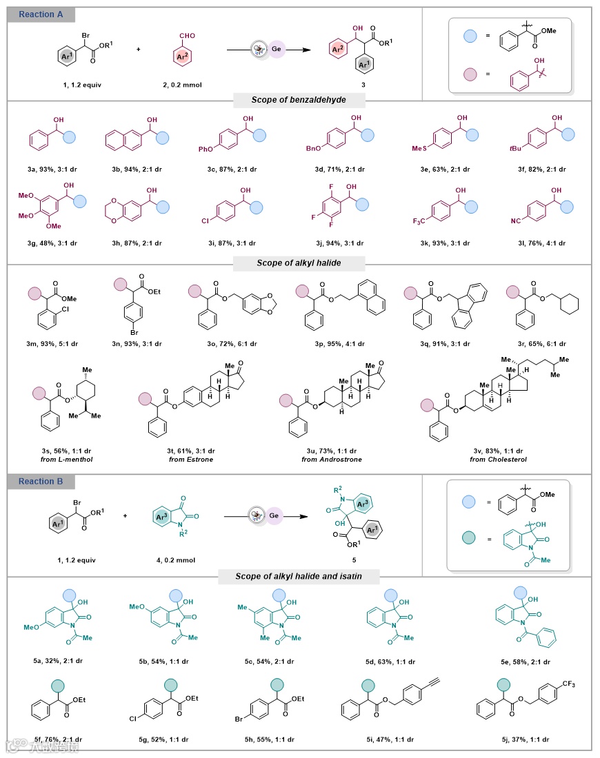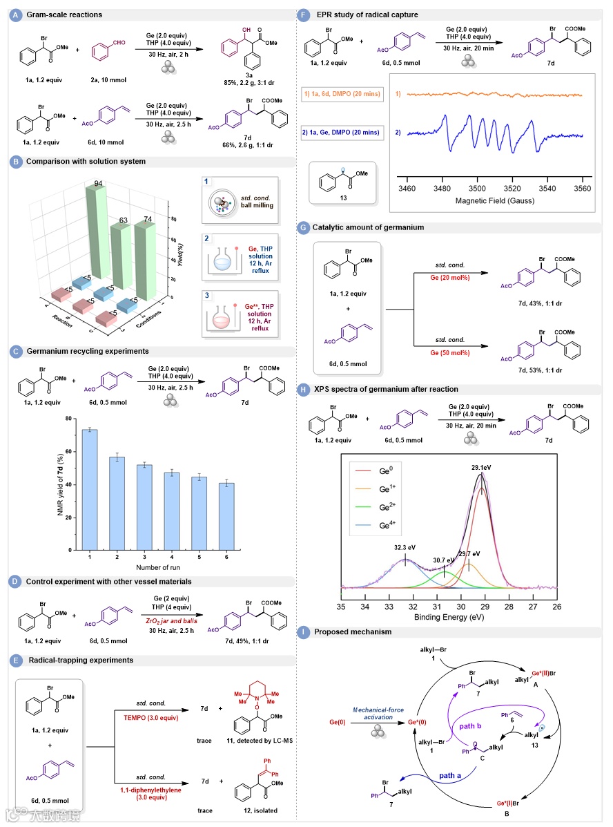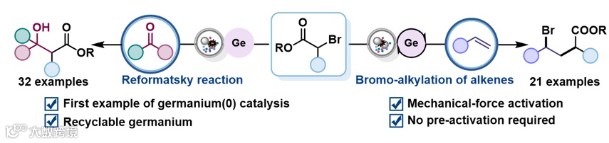 在该研究中,作者开发了一种在无溶剂球磨条件下激活单质锗的创新方法。该方法实现了单质锗介导的Reformatsky反应,而不需要外部还原剂。同时,作者首次揭示了单质锗的催化活性,证明了它在机械刺激下对烯烃溴化反应的催化有效性。这项开创性的工作不仅建立了一种新的机械化学策略来激活单质锗,而且为其作为催化剂的使用开创了先例,标志着合成化学的重大进步。