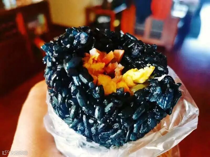 将准备好的饭团配菜放入乌米中包裹成团,一份乌米饭团就做好了~