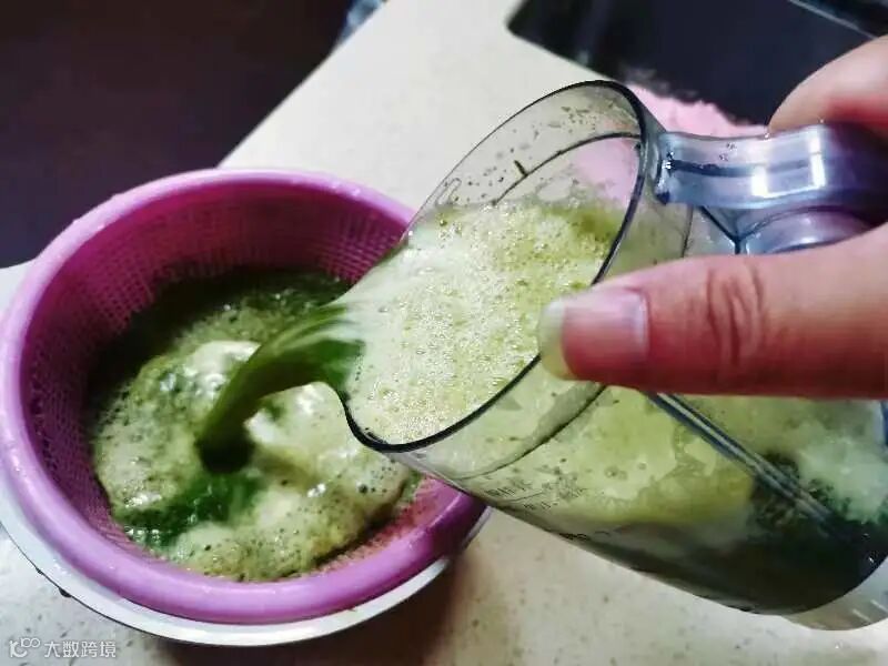 过滤乌饭叶汁,将过滤后的汁水倒入清洗过的糯米中,搅拌均匀,并浸泡。