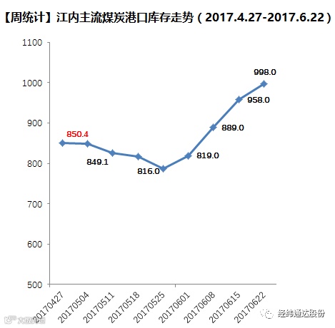 根据煤炭江湖中国主流煤炭港口库存数据分析《环渤海库存下降,江内库存继续上升——中国主流煤炭港口库存20170622》:江内主要煤炭港口库存从5月底(787万吨)开始快速上升,连续4周涨至6月22日(998万吨),上涨近200万吨,涨幅27%。据相关渠道了解,本周江内库存还在上涨。如皋、张家港华达、江阴港5、靖江扬子江等江内港口库存接近于饱和。江内库存快速上涨的时间段与6月份环渤海库存下降的周期基本一致。