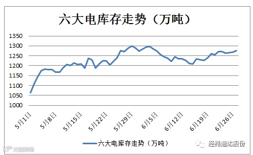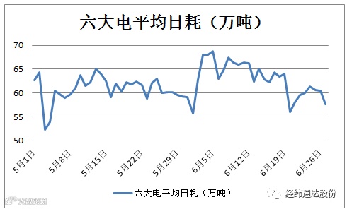 自5月开始,六大电力平均库存延续攀升走势。从5月1日(1065万吨)升至6月27日(1275万吨),涨幅20%;电厂平均日耗近2个月保持区间波动,5月底至6月初的几天曾经快速上升,随后又快速回落。库存可用天数,从5月1日开始,整体呈震荡上升走势,近期已升至约23天的较高水平。