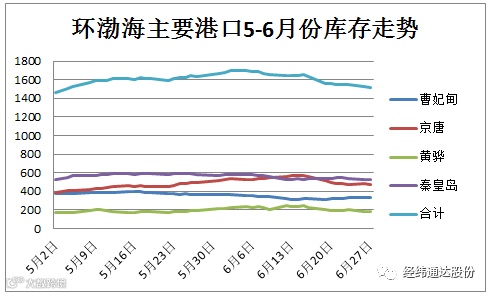 环渤海港口(天津港除外)库存走势,5月份开始,环渤海库存逐步攀升至最高6月2日约1700万吨。6月3日开始,库存逐步走低,至6月27日库存量1520万吨,下降近200万吨,降幅11%。这个区间正好与6月初煤矿价格上涨时期基本吻合。