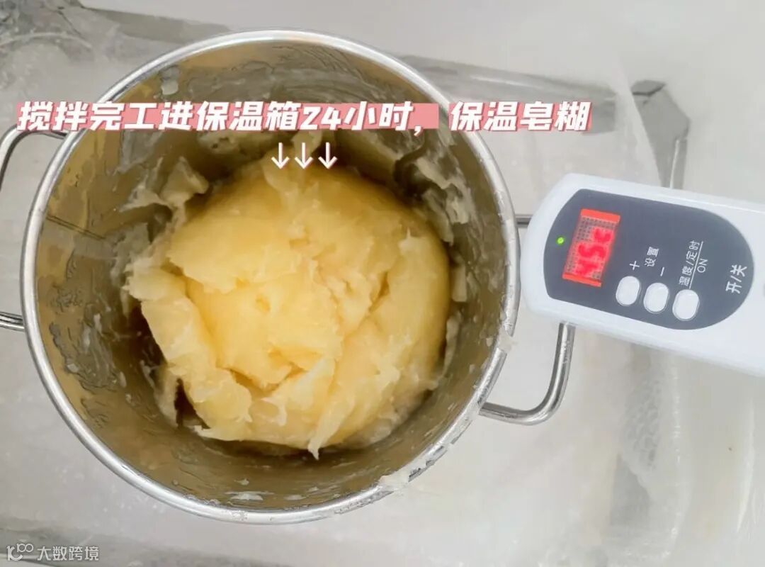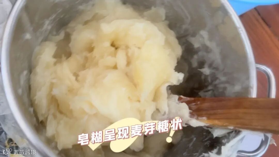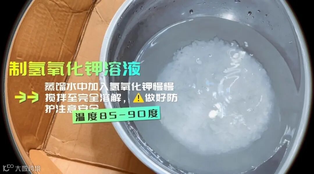 将水称量好放入不锈钢锅中,缓慢倒入称量好的氢氧化钾,搅拌至完全溶解。因为此时会释放大量的热,大概90℃左右,大家一定要注意安全。