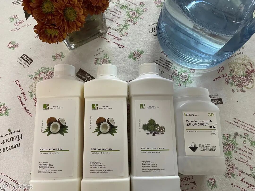 制作手工皂需要的氢氧化钠和氢氧化钾皆属强碱,一旦碰到容易造成灼伤,所以大家在制作手工皂前一定要做好安全防护,全程佩戴手套、口罩、护目镜,穿上围裙。如不小心碰到碱液请立即用水大量冲洗哦。