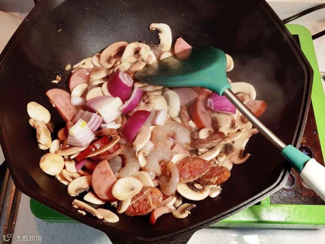 锅中加入黄油,待黄油化开加入腊肠、火腿肠、白蘑菇、虾仁和洋葱,翻炒3—5分钟,盛出备用。