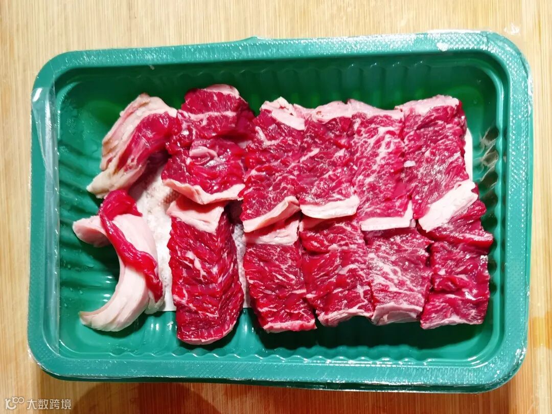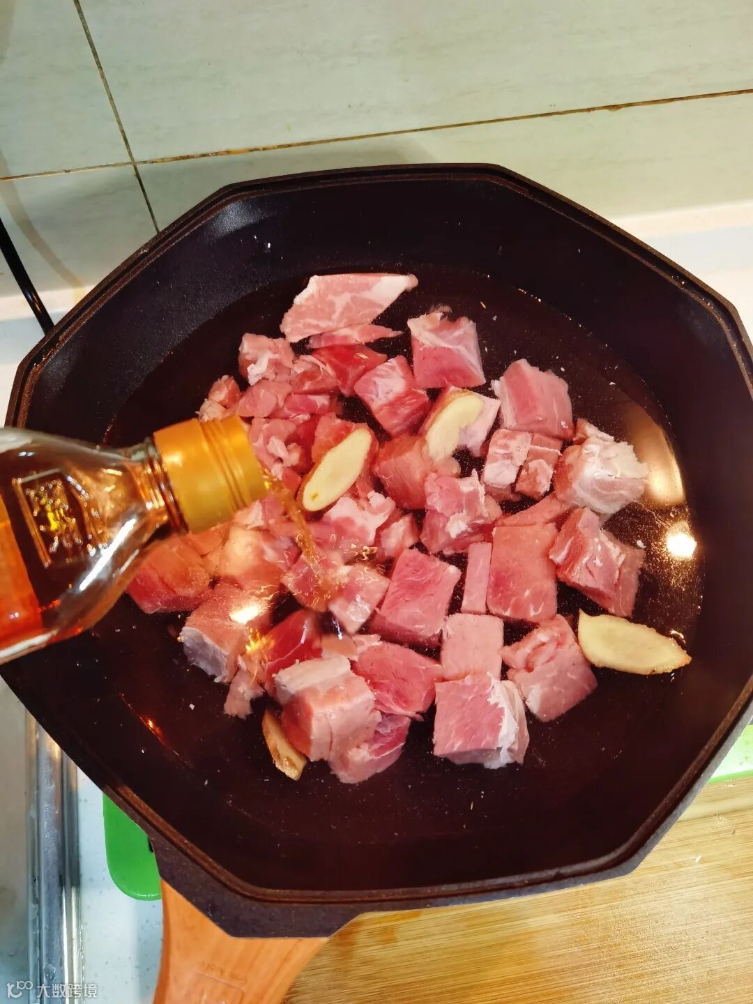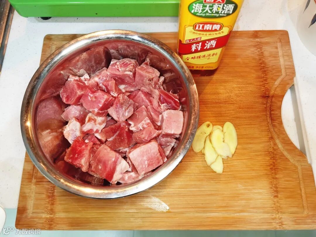 冷水下入牛肉块,同时加入料酒和姜片,煮至冒出血沫,捞出牛肉块。