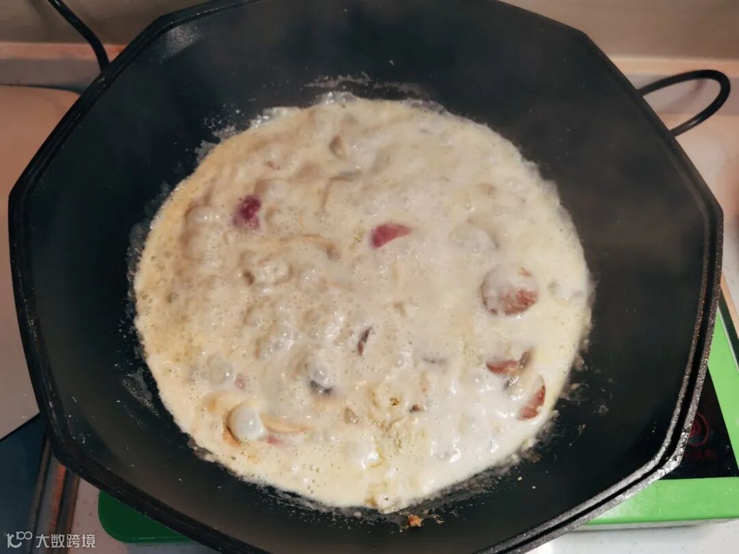 锅中再次加入黄油,化开后加入面粉小火煸炒2—3分钟,加入热牛奶和少量热水,倒入炒好备用的食材和面包糠,小火炖煮15—20分钟,出锅前加入适量的食盐和少许白砂糖。