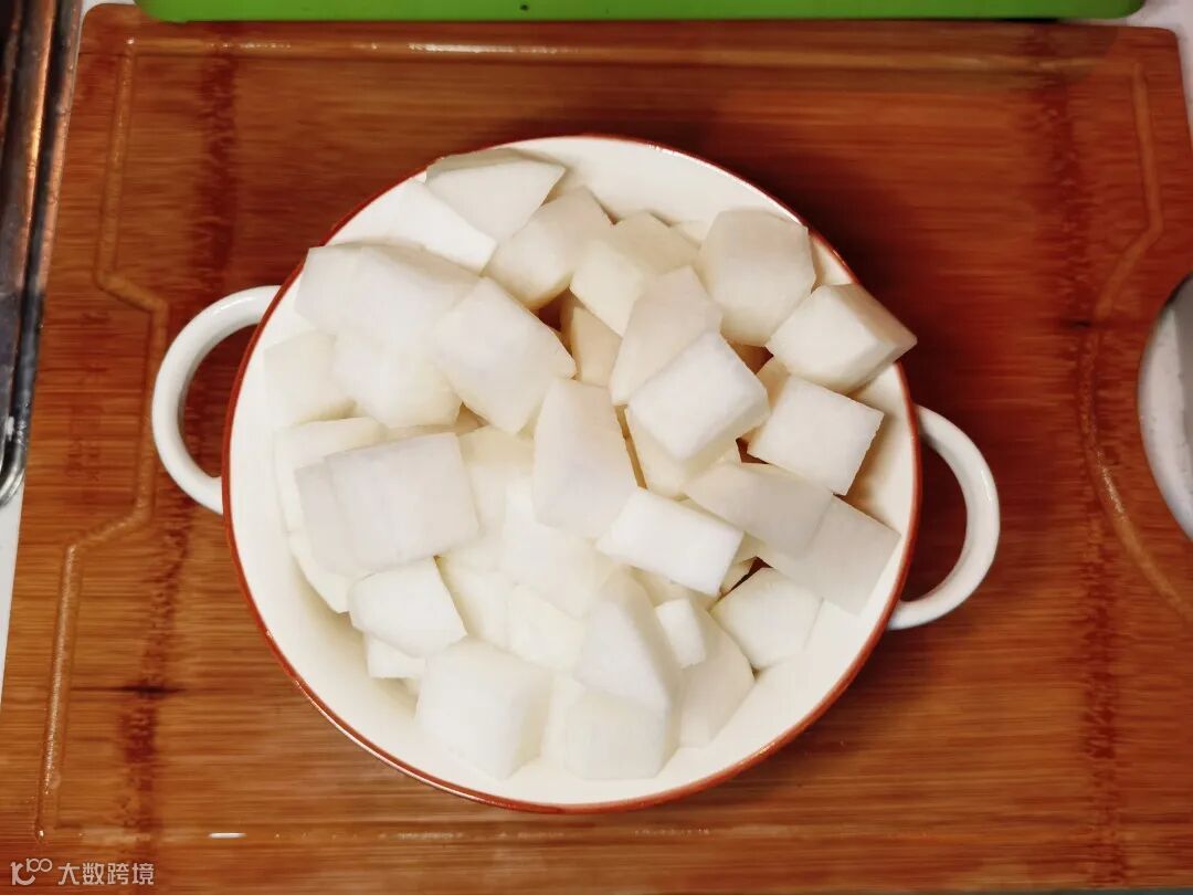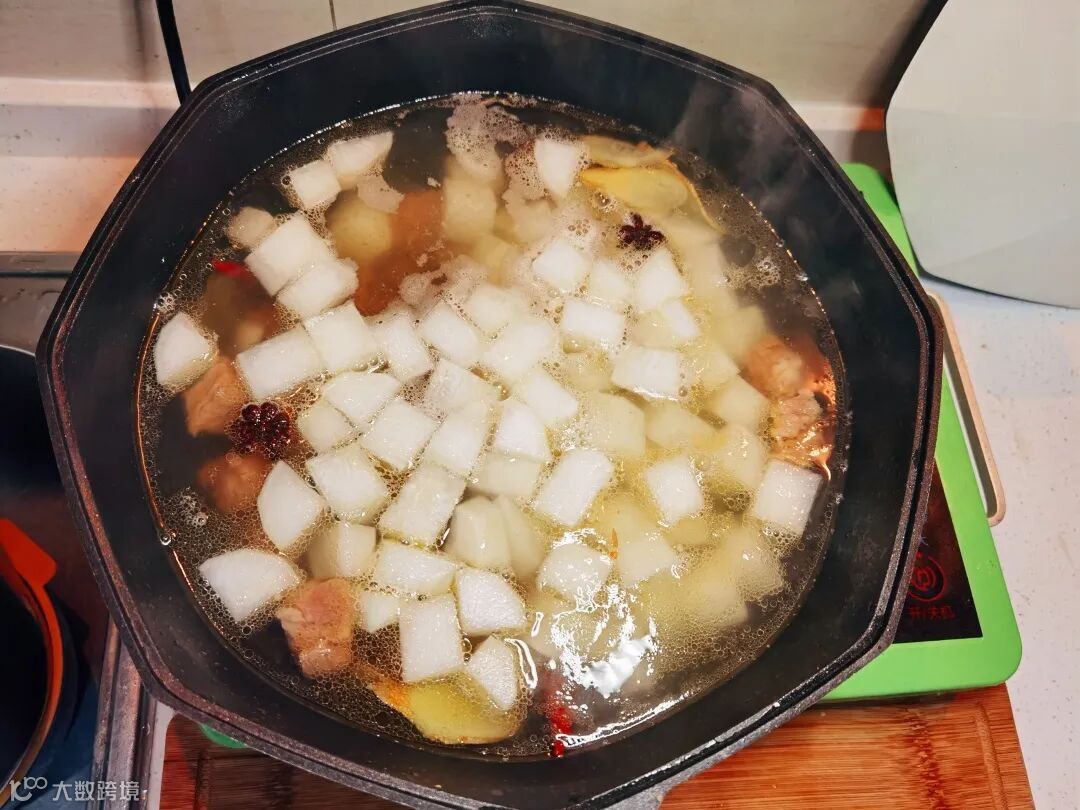 高压炖煮好的牛肉连汤一起倒入锅中,加入萝卜块、少量葱姜粉和白胡椒粉,中火炖煮20—30分钟,再加入适量的食盐和少量白砂糖,大火炖煮5—10分钟即可。