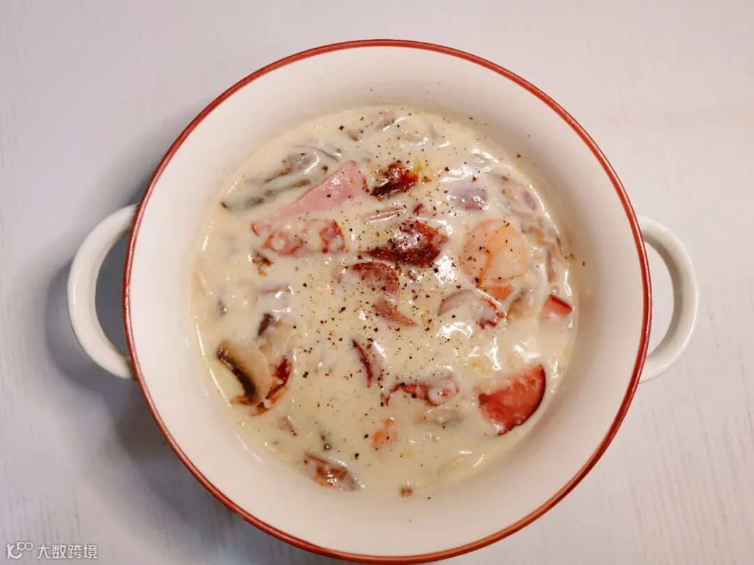 盛出撒上黑胡椒,汤汁浓郁的奶油蘑菇汤就做好了。